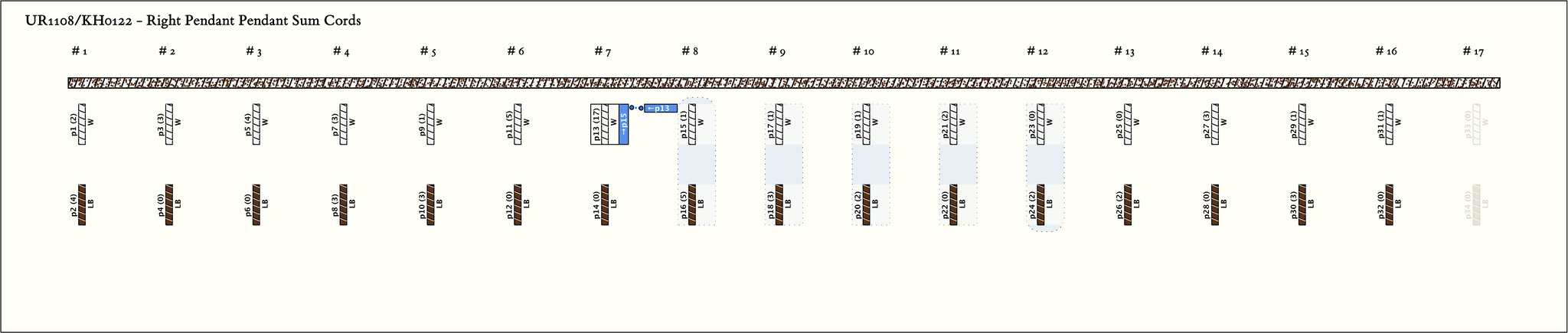 - By spacing, there are 17 pairs of pendants. In each pair, the first is W and the second LB.