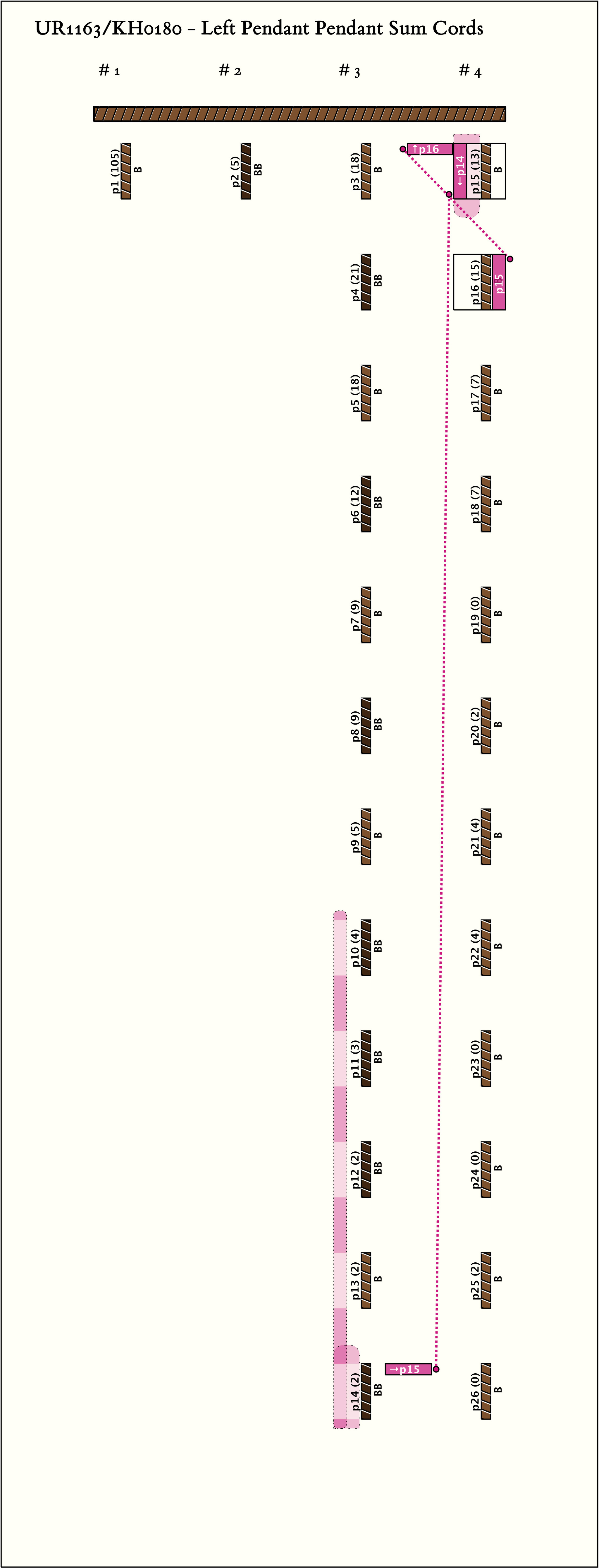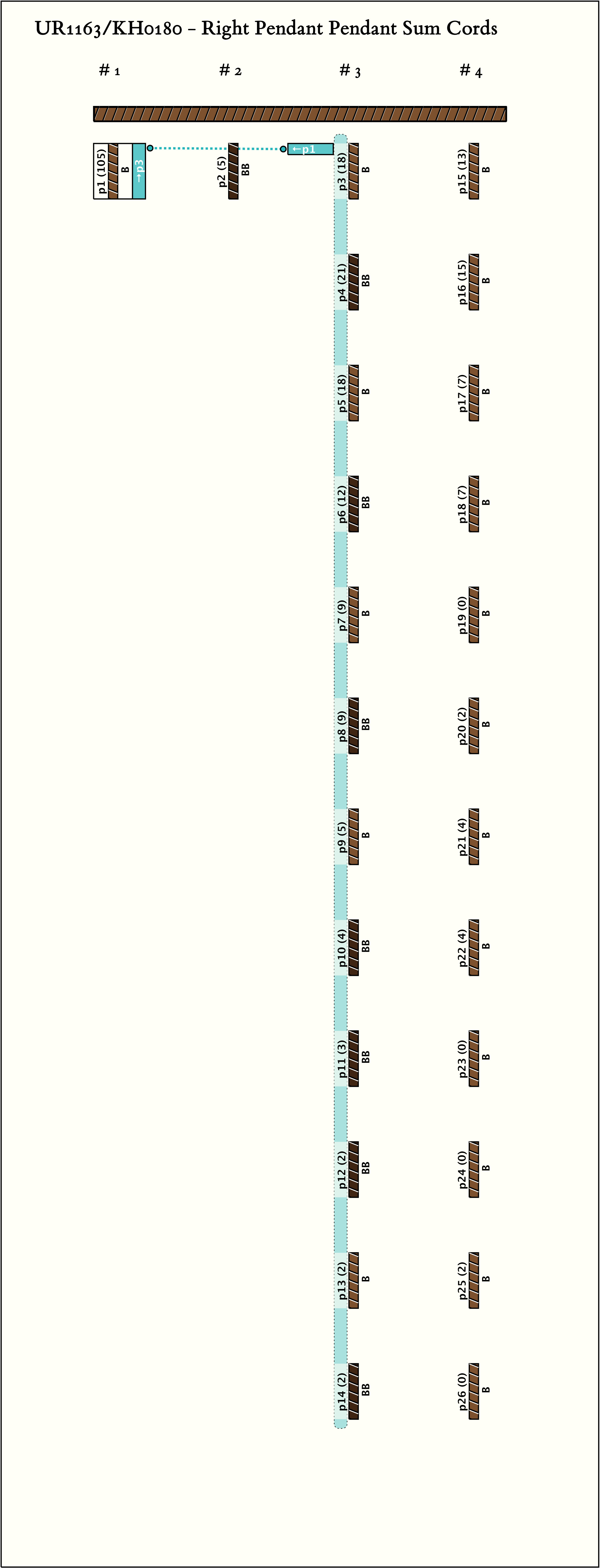 - Construction note: The twisted end of cord 1 is linked through the twisted end of the main cord so that it dangles from the end of the main cord. (See diagram for UR1100.)
