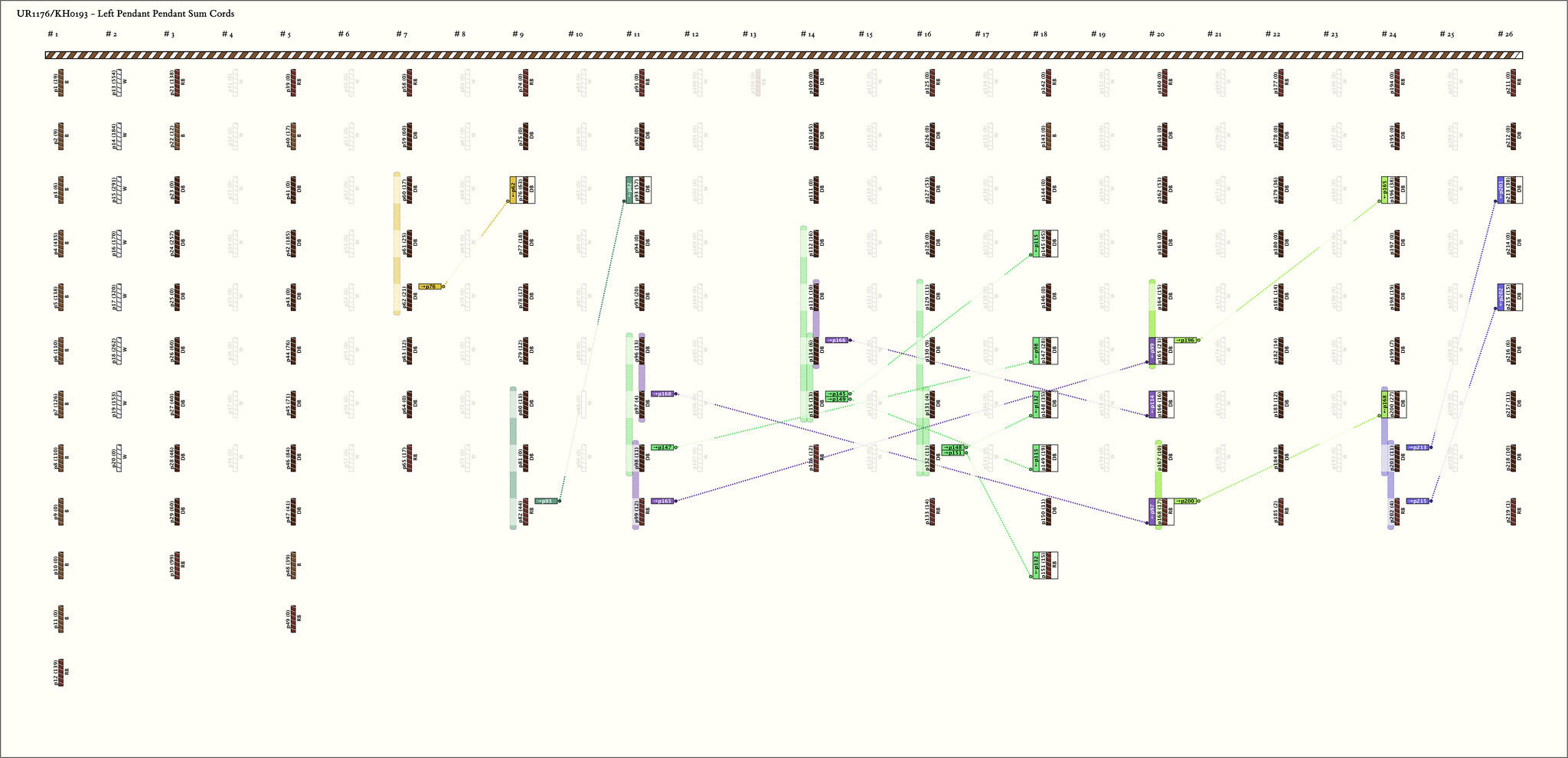 - By color, the khipu is separated in 25 groups. The first group is 12 pendants. Then there are 24 groups alternating in color pattern. Basically the pattern is a group of 8 pendants color W, followed by a group of 9 pendants colored RB, 7 DB, RB. (The exceptions t o the pattern are: groups 3, 5, and 17 each have an additional pendant between positions 1 and 2; groups 5, 7, and 9 each have an additional pendant between positions 8 and 9; in groups 7 and 9, position 4 is non-existent; and in group 7, position 2 is also non-existent. ) Starting with group 4, all groups of W pendants are of value 0 (or blank) and, in the alternate groups, all values in positions 1, 2, and 4 are 0 (or blank).