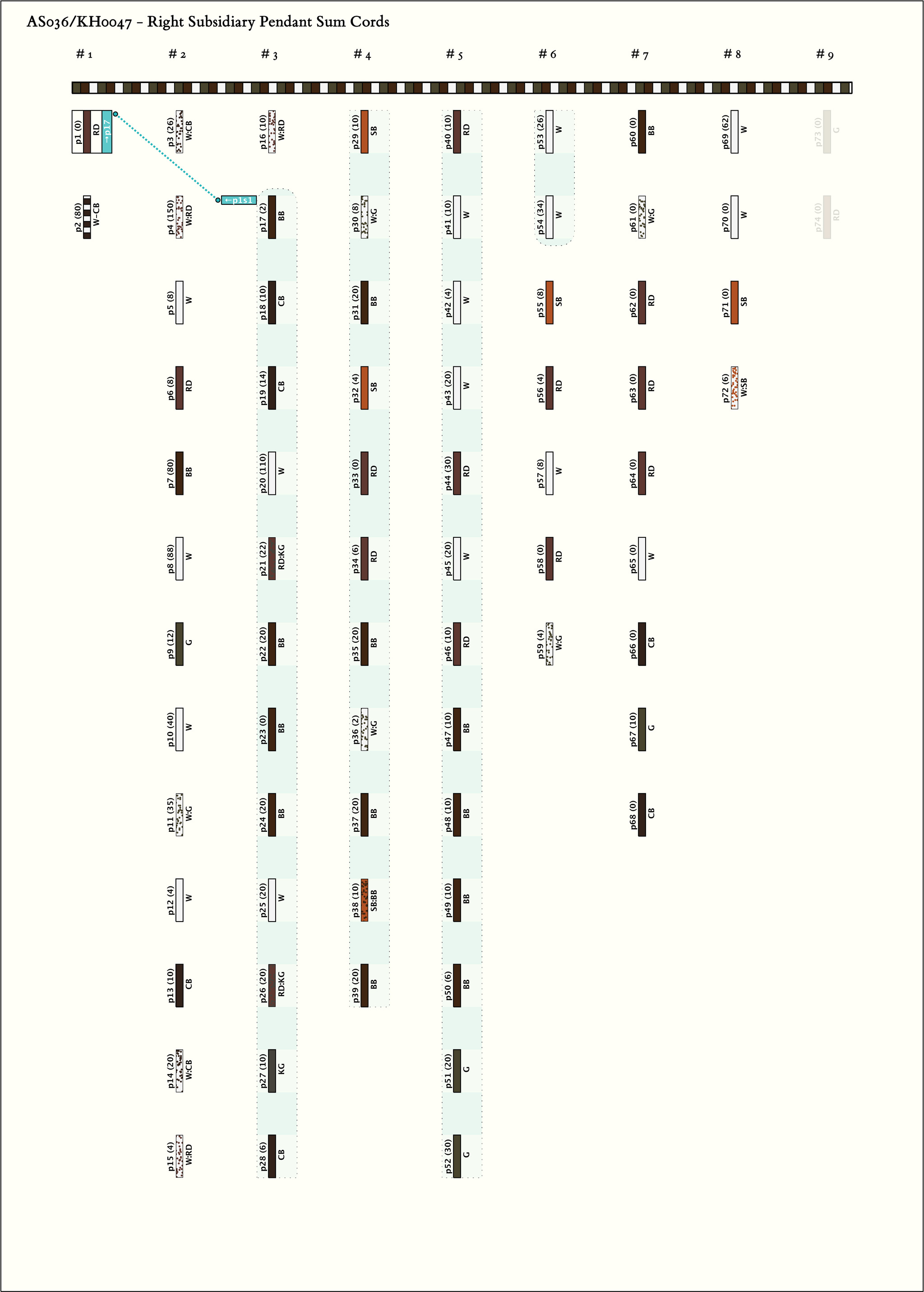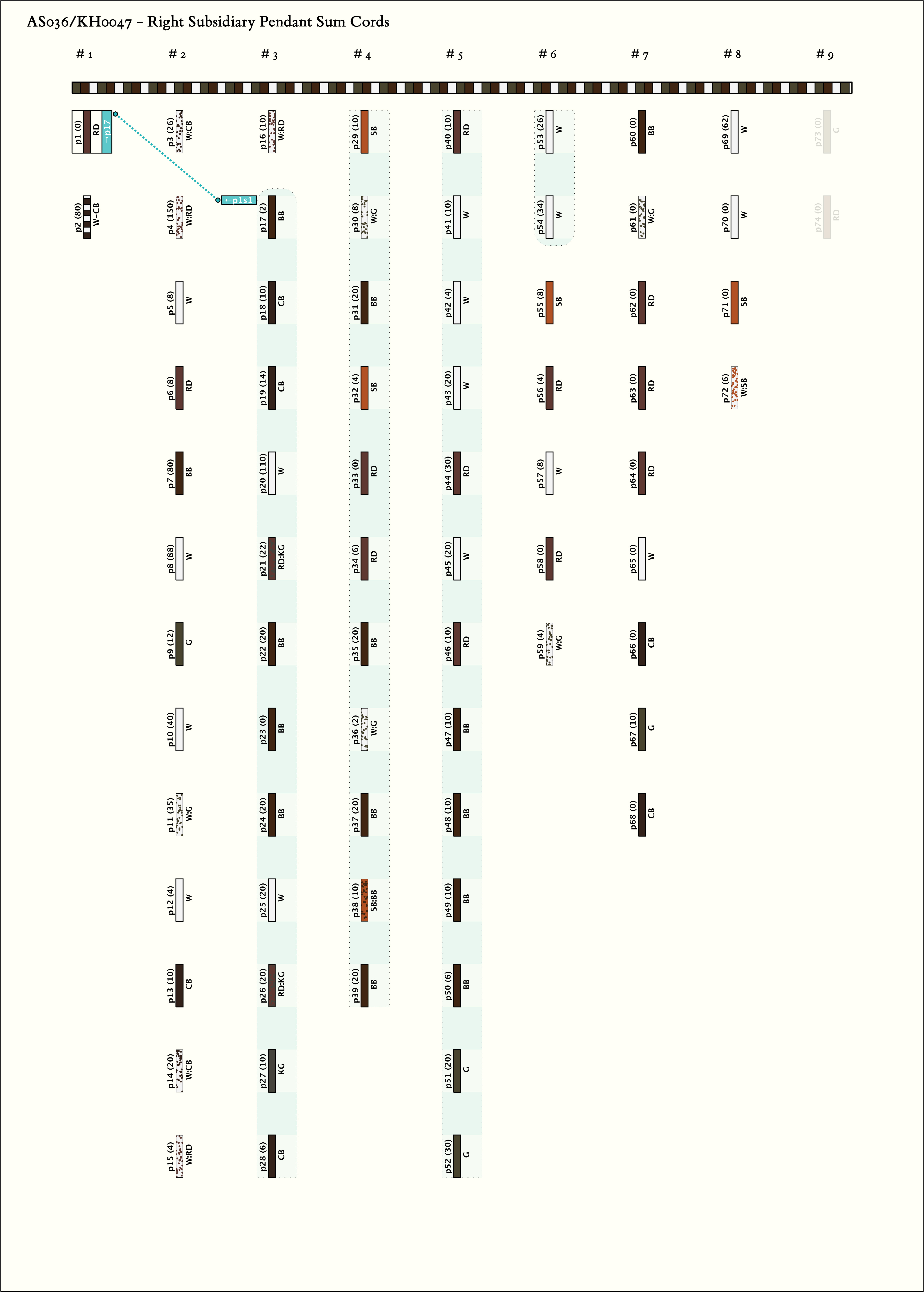 - The colors W, G, RD, SB, BB, CB, and KG appear alone or in combination on both AS036 and AS037 . AS037 uses the 2 additional colors B and LG . Neither of the khipus have been given numerical interpretation.
