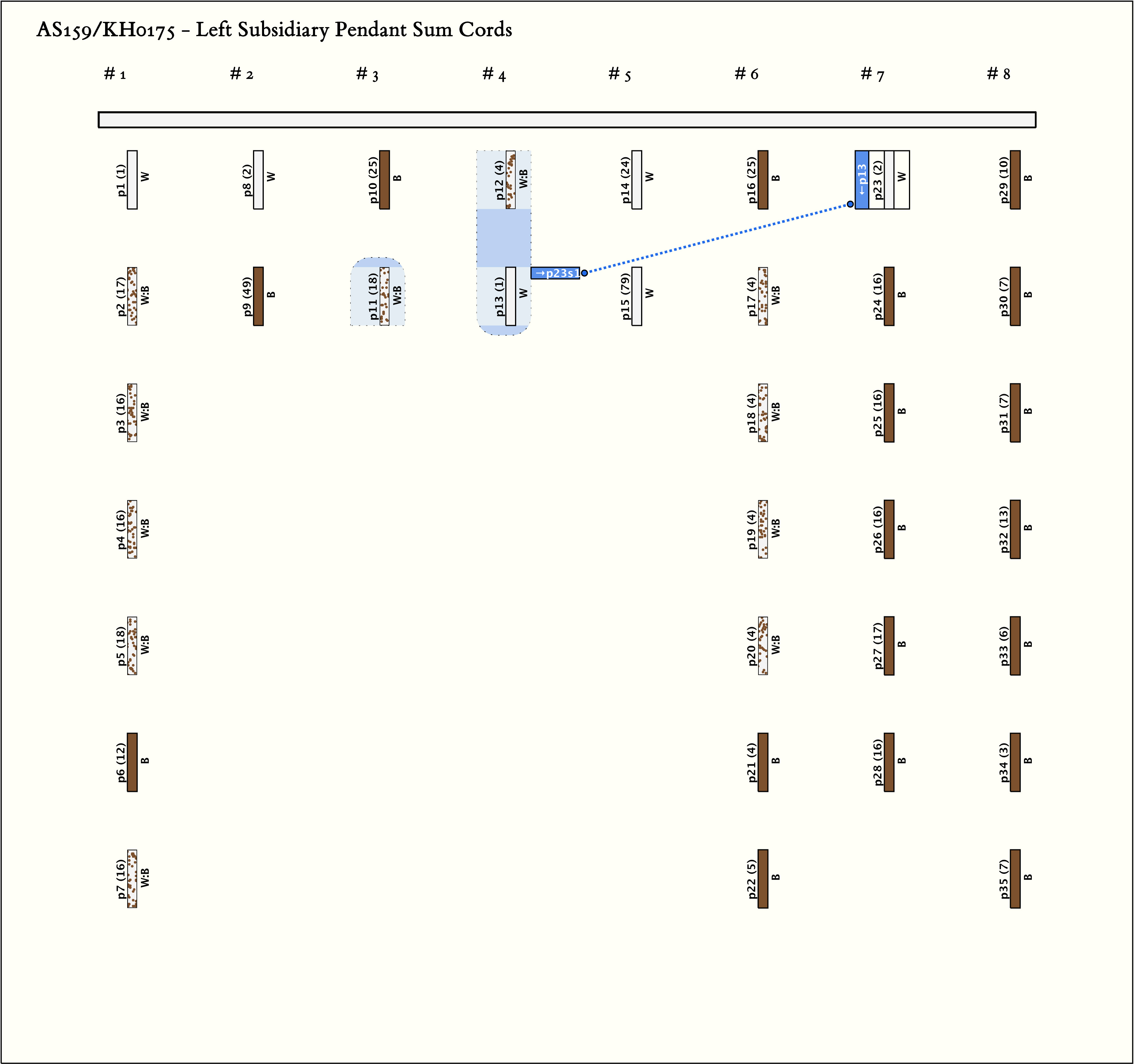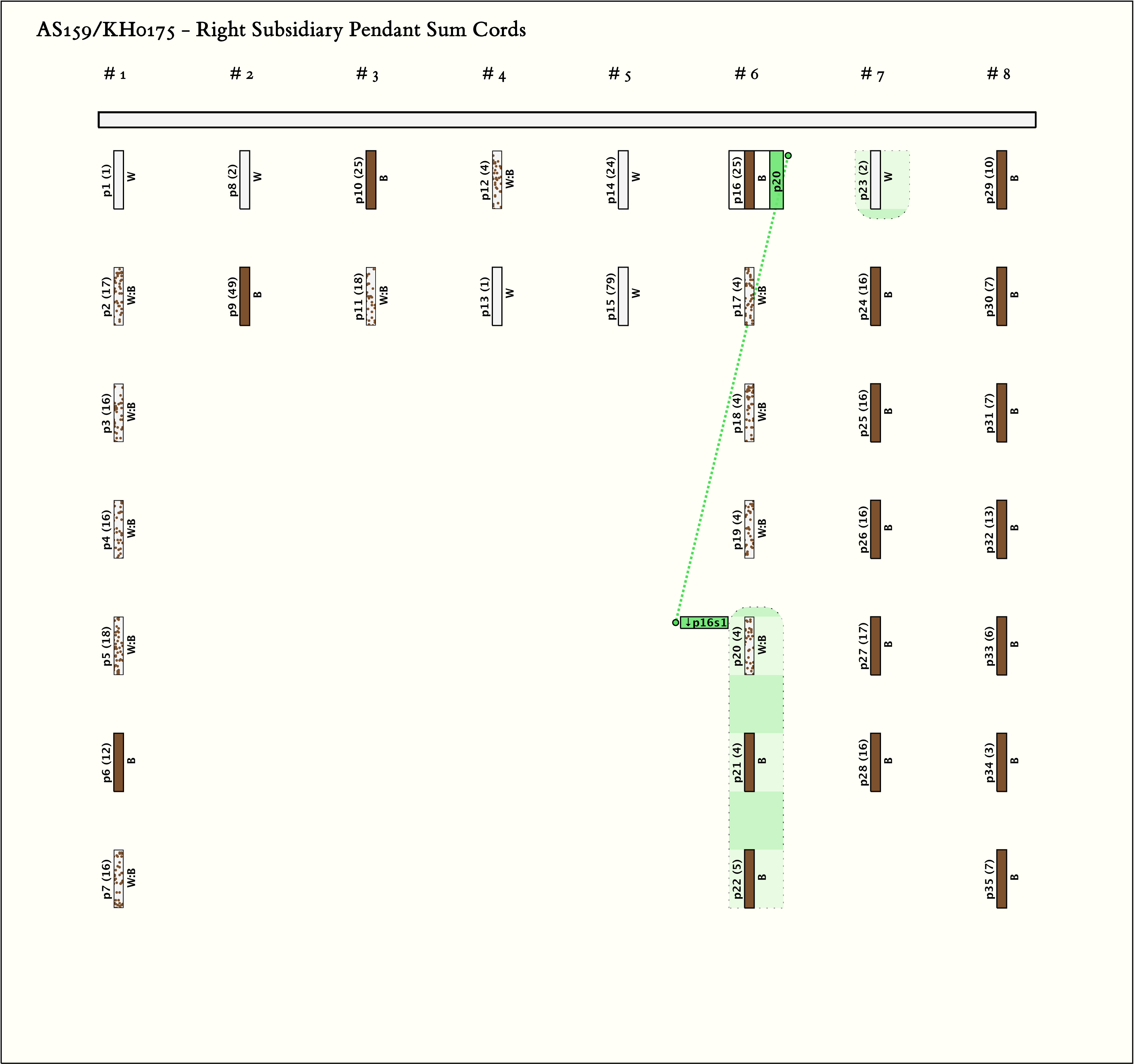 - By spacing, there are 8 groups with different numbers of pendants. There are much larger spaces on the main cord between groups 6-7 and 7-8 than there are between others. The only consistent colors are in the 3 groups with 7 pendants each (groups 1, 6, and 8). Group 8 is unified: all pendants are B. Groups 1 and 6 both have the pattern X, 4B:W, 2X where X=W in group 1 and X=B in group 6.