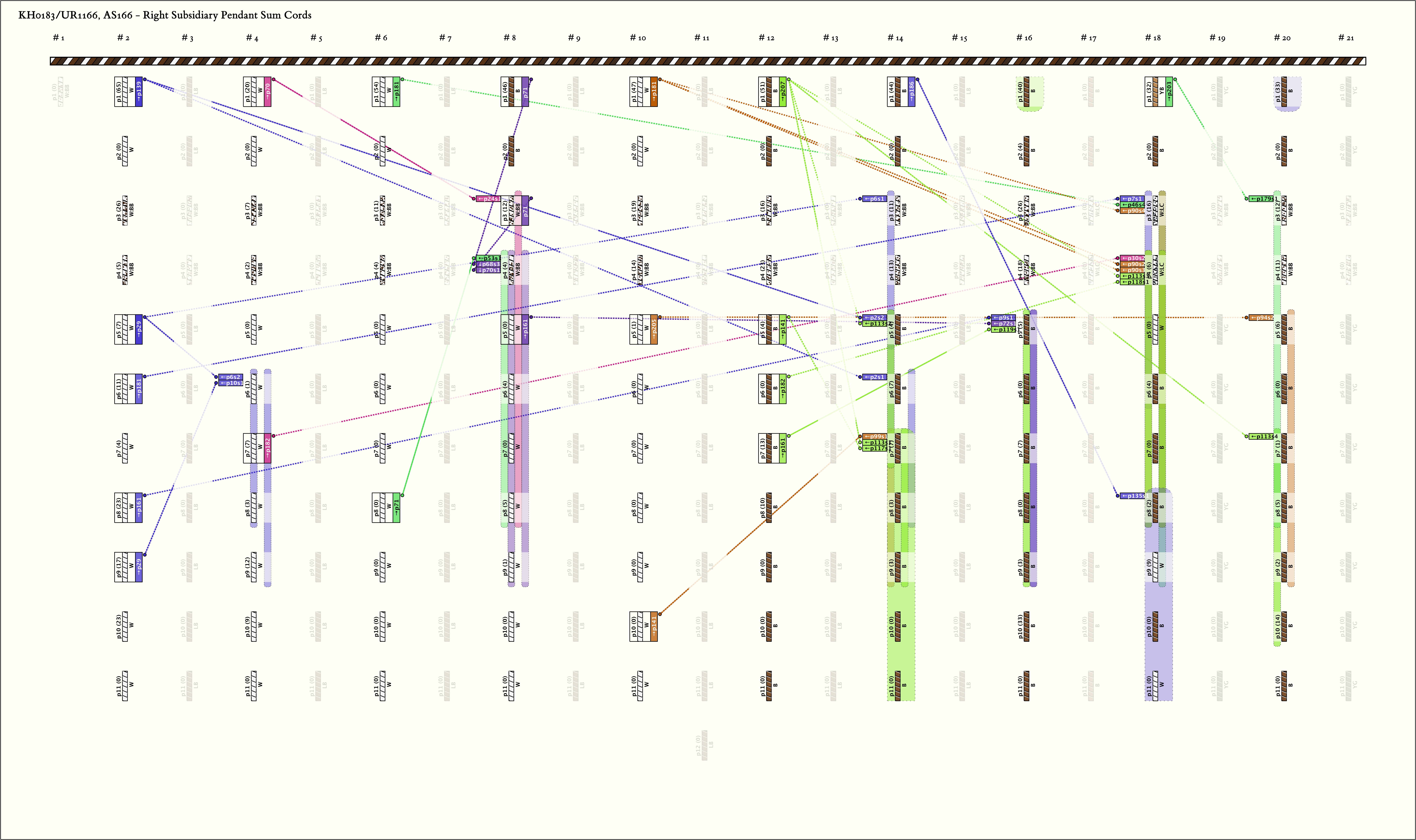 - Construction note: The twisted ends of the main cord and first cord are linked together. Cord 1 is shorter than the other pendants and bound with thread at its end. 2.Construction note: Subsidiaries attached to the first subsidiary on pendants 2, 24, 135, 157, 179, and 201 are attached in a non-standard way. They are looped around both the pendant and subsidiary to which they are connected.