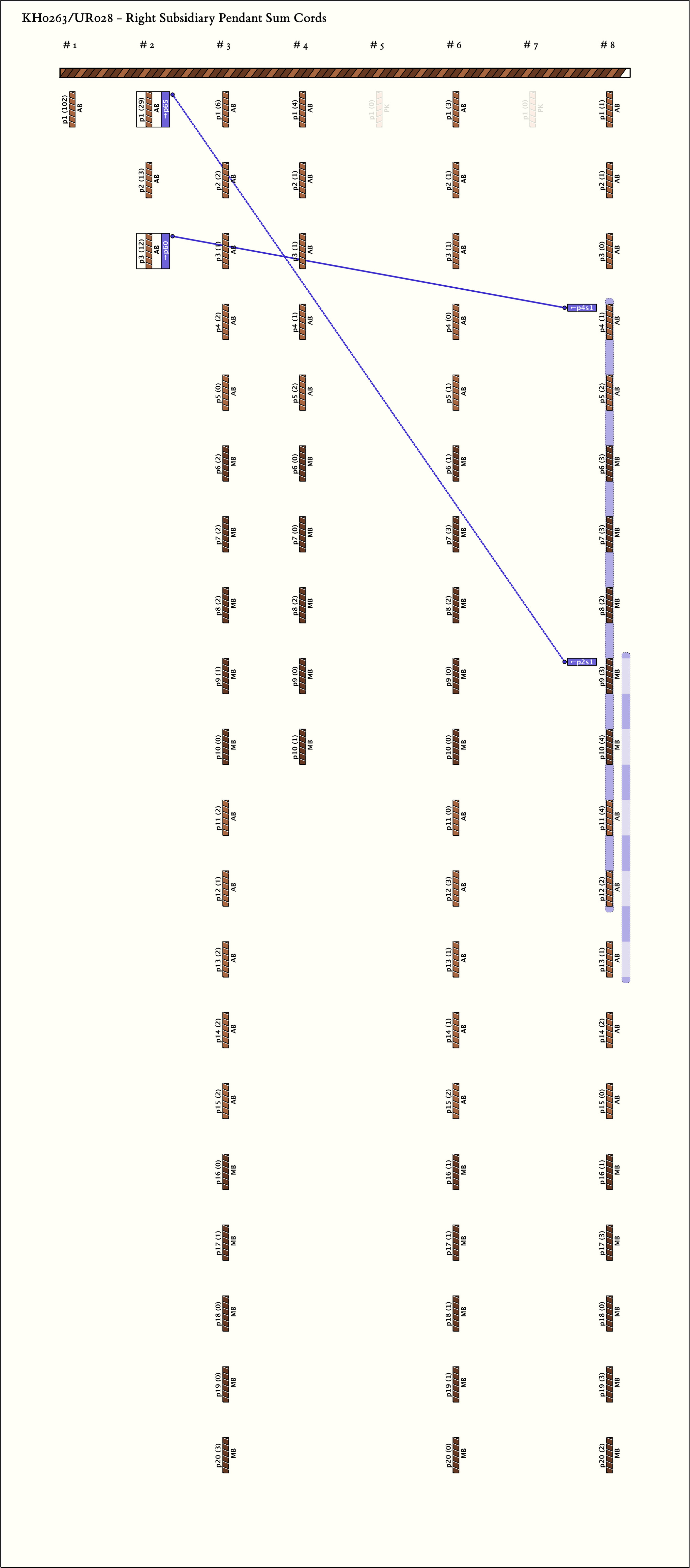 Cord p1 is the sum of p2-p4 including subsidiaries. Cord p5-p74 are grouped into various five-cord sets. Cluster 3,6, and 8 have 20 cords - 4 color-banded sets of 5 cords, alternating between MB (Moderate-Brown) and AB (Light-Brown). Cluster 4 is similar, with 2 alternate colored, color-banded, sets of 5 cords.