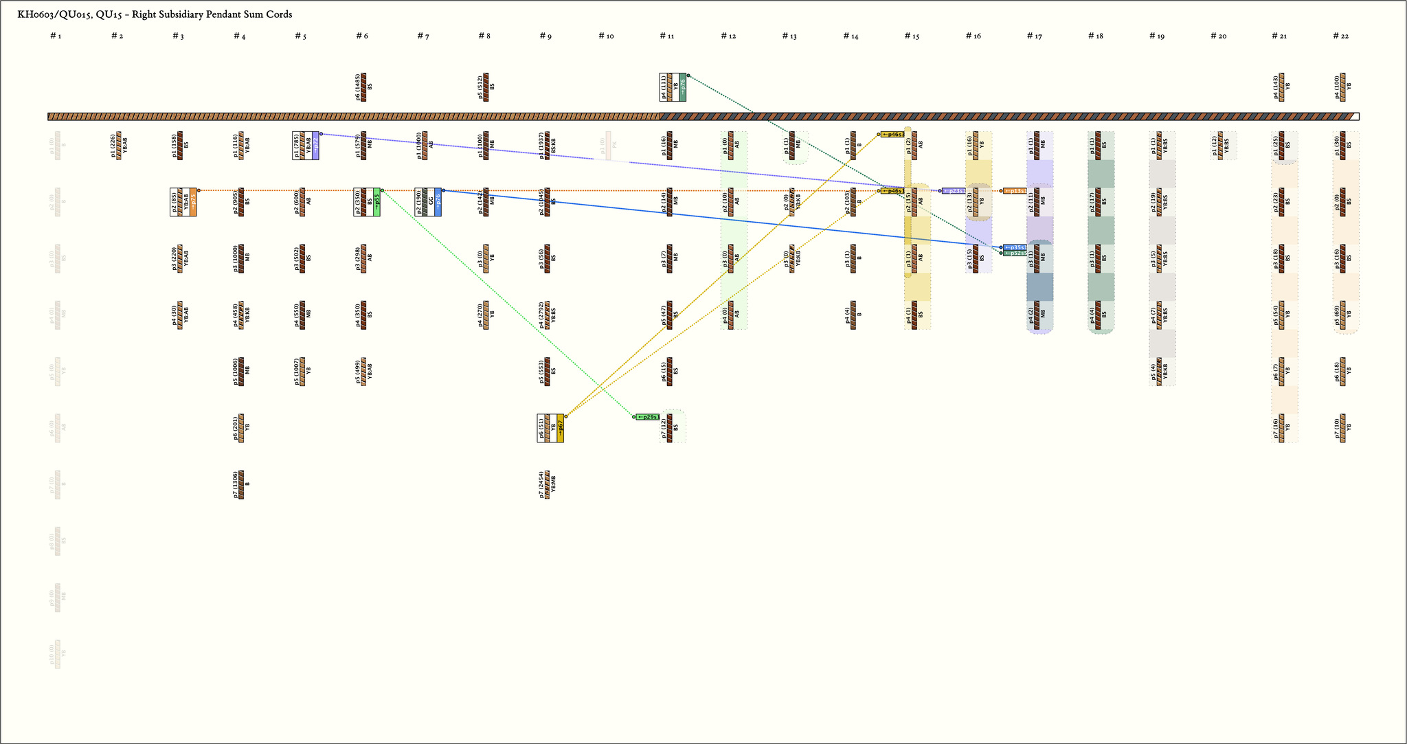 Some subsidiary cords are attached through one strand of the plied pendants rather than around entire pendant.