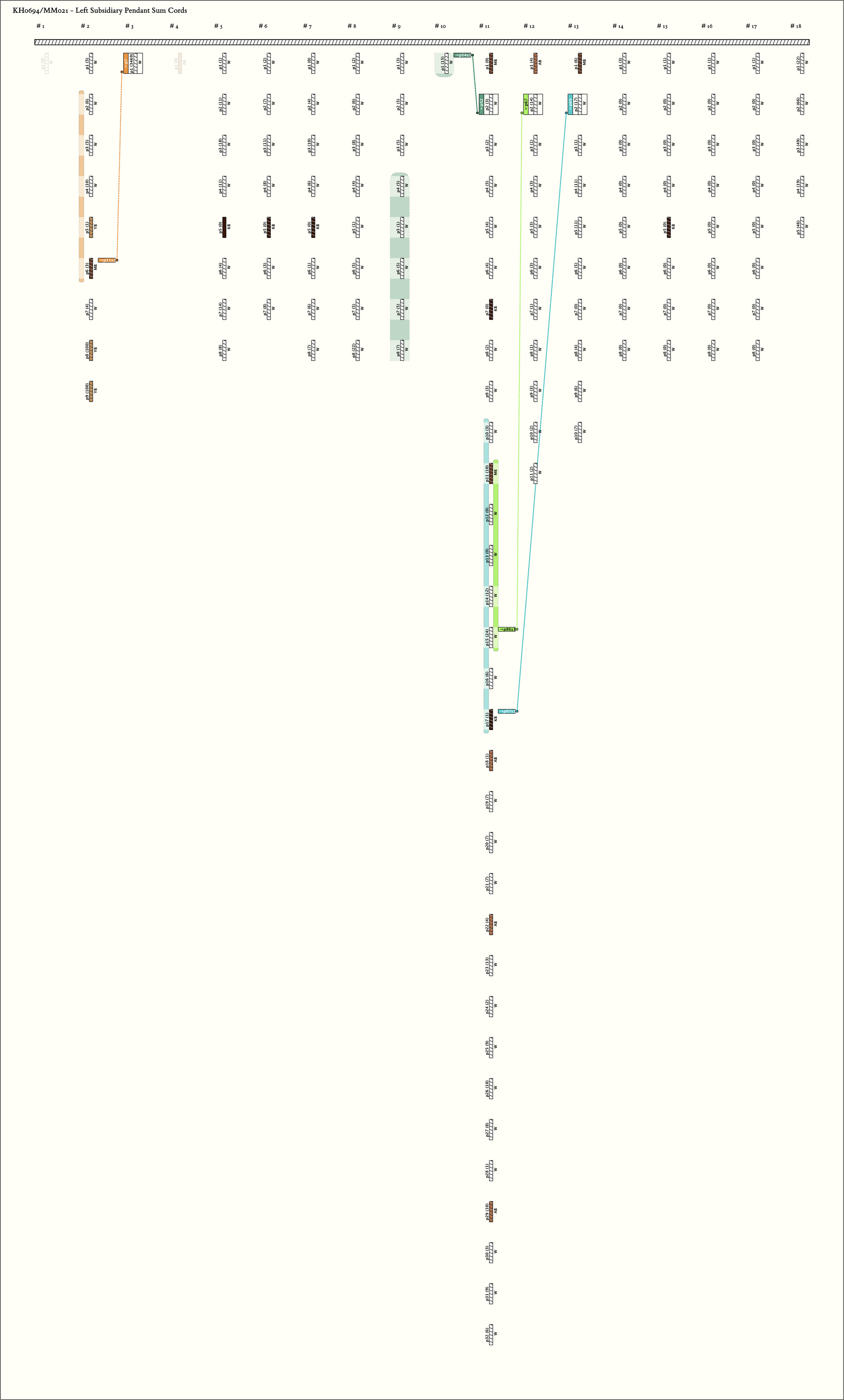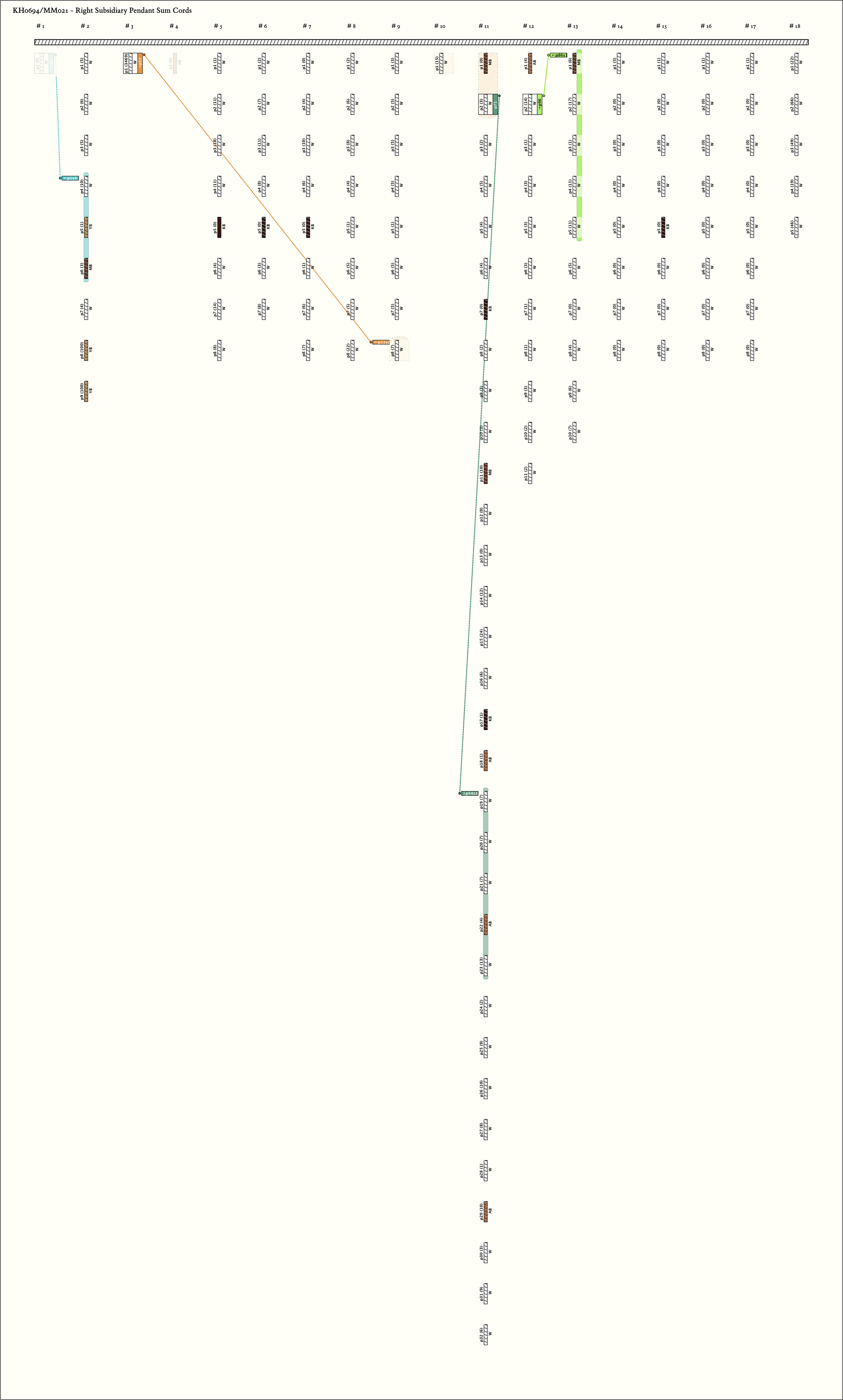 1: p1 subsidiaries (p1s1-P1s6) attached with pendant-like attachment knots, though p1 is not significantly thicker than other pendant cords, suggesting this is not a subsidiary primary cord