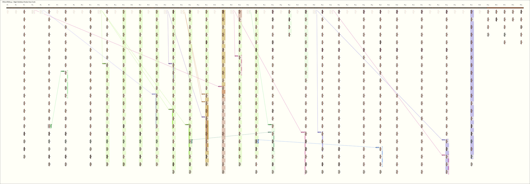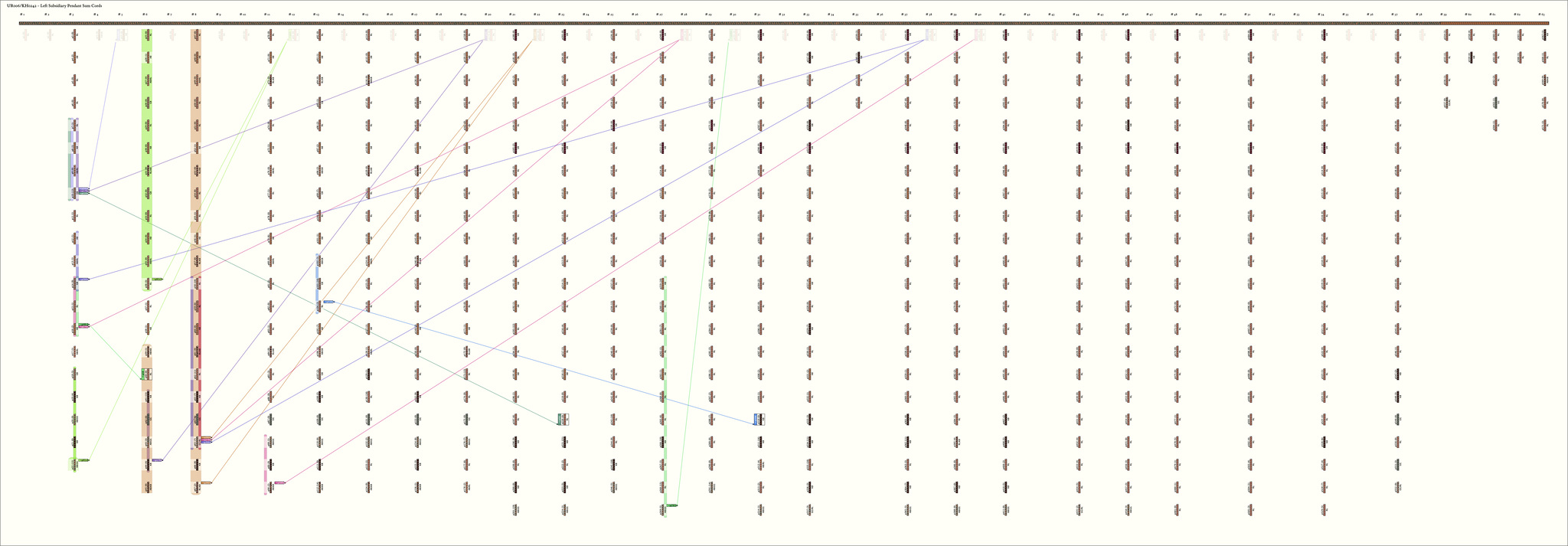 Khipu UR006 contains a total of 762 pendant strings made of Z-spun, S-ply cotton fibers. Compared to other khipus in this collection, the pendant strings of khipu UR006 are attached to the primary cord and organized in an unusual, highly systematic manner. That is, with only a few exceptions, the basic unit of organization of the pendant strings is a paired set. One member of these paired sets is composed of either 20, 21, or 22 pendant strings; these pendant strings are attached directly to the primary cord. The other member of each paired set is composed of 8, 9, or 10 pendant strings. These latter pendants, however, are not attached directly to the primary cord; rather, they are attached to a string whose two ends are themselves attached to the primary cord. These "intermediary" strings (i.e., as they stand between, and connect, the pendant strings and the primary cord) hang down below the primary cord in a slight arc, or loop. I will refer to these intermediary strings and the pendants attached to them as "loop pendants." There are 24 groups of these paired sets of pendant strings and loop pendants on khipu UR006 (see Figures 6 and 7). Note by Ashok Khosla. The small loop pendant set of {8,9,10} cords are labeled as top cords in the Harvard KDB, and as such, are drawn here as top cords.Before proceeding, I should note that in the calendrical analysis of khipu UR006 that I will present in this section, I will disregard the 32 pendant strings on this sample that do not conform to the regular arrangement of paired-that is: [20, 21, 22] + [8, 9, 10] sets of pendant strings as outlined above. The excluded pendant strings are Clusters #59-#63 at the right end of the primary cord - AMK. The knot counts on these excluded strings will come into play later in my analysis. I believe that these strings, which do not conform to the pattern of paired sets, may have been used, in some manner that I do not entirely understand at present, to provide flexibility in relation to one of the principal uses of this khipu-that is, as a biennial calendar.