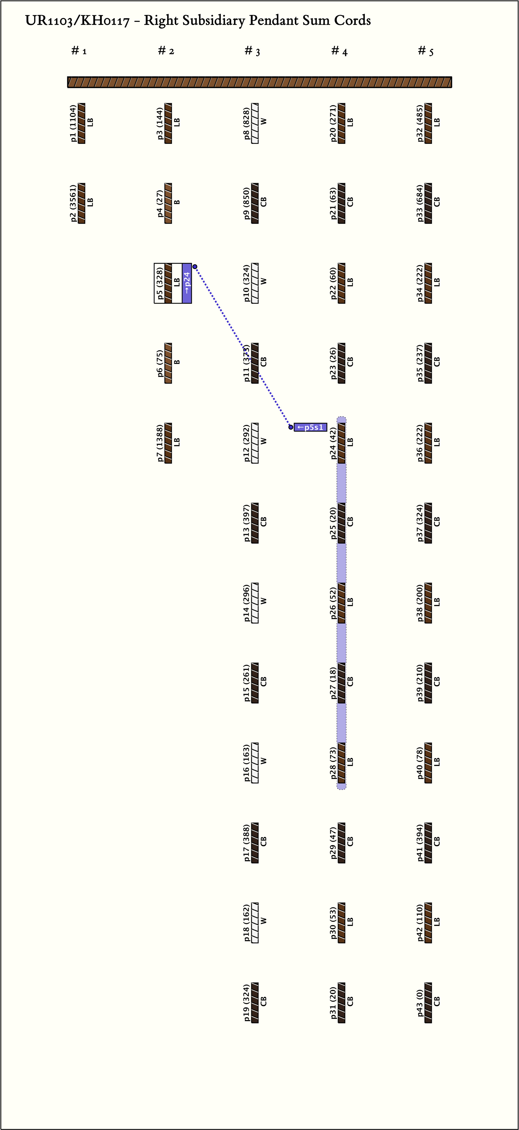 - By spacing, the khipu is separated into 2 end cords, 1 group of 5 pendants, and then 3 groups of 12 pendants each. With 1 exception, each of the pendants in groups 1, 3, and 4 have 1 subsidiary each.