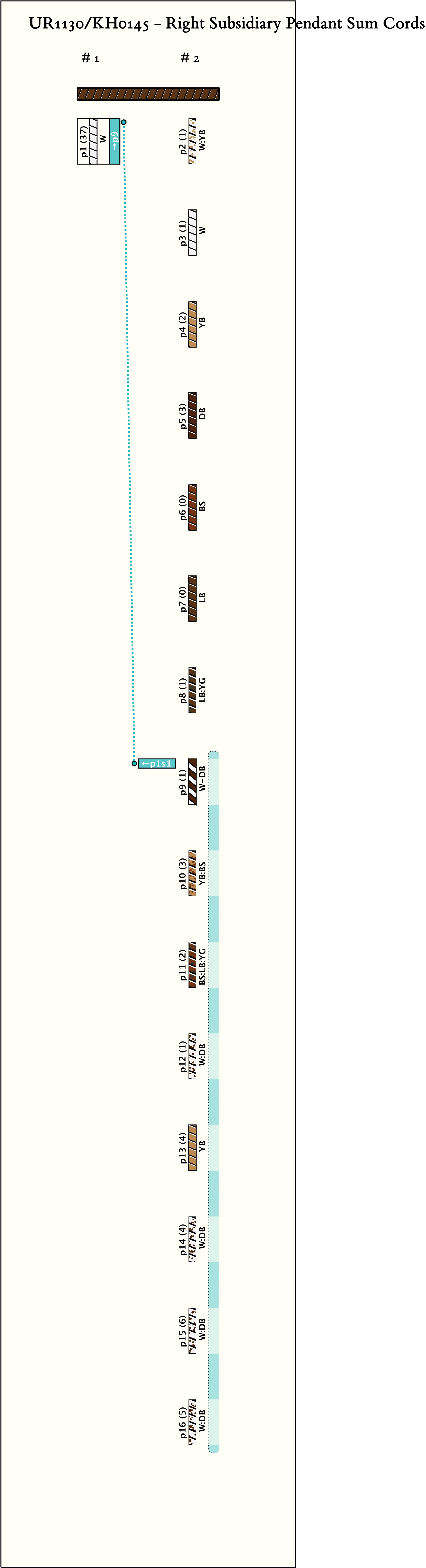 - Construction note: The twisted end of cord 1 is linked through the twisted end of the main cord so that it dangles from the end of the main cord. (See diagram for UR1100.)