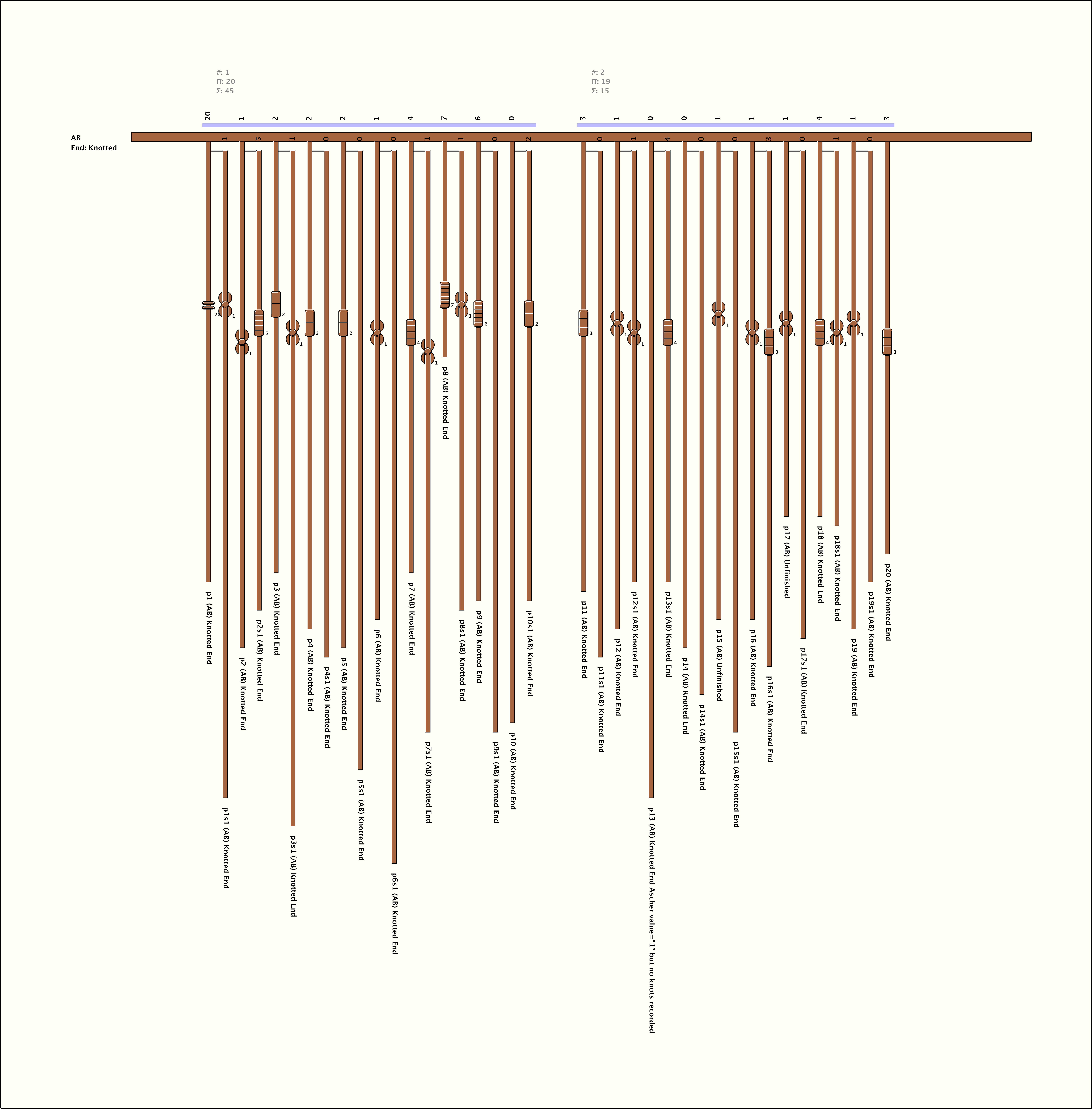 Total Number of Cords: 39 Number of Ascher Cord Colors: 1 Similar Khipu: Previous (AS215F) Next (AS061/MA036) Catalog: AS017 Khipu Notes: Khipu Notes |