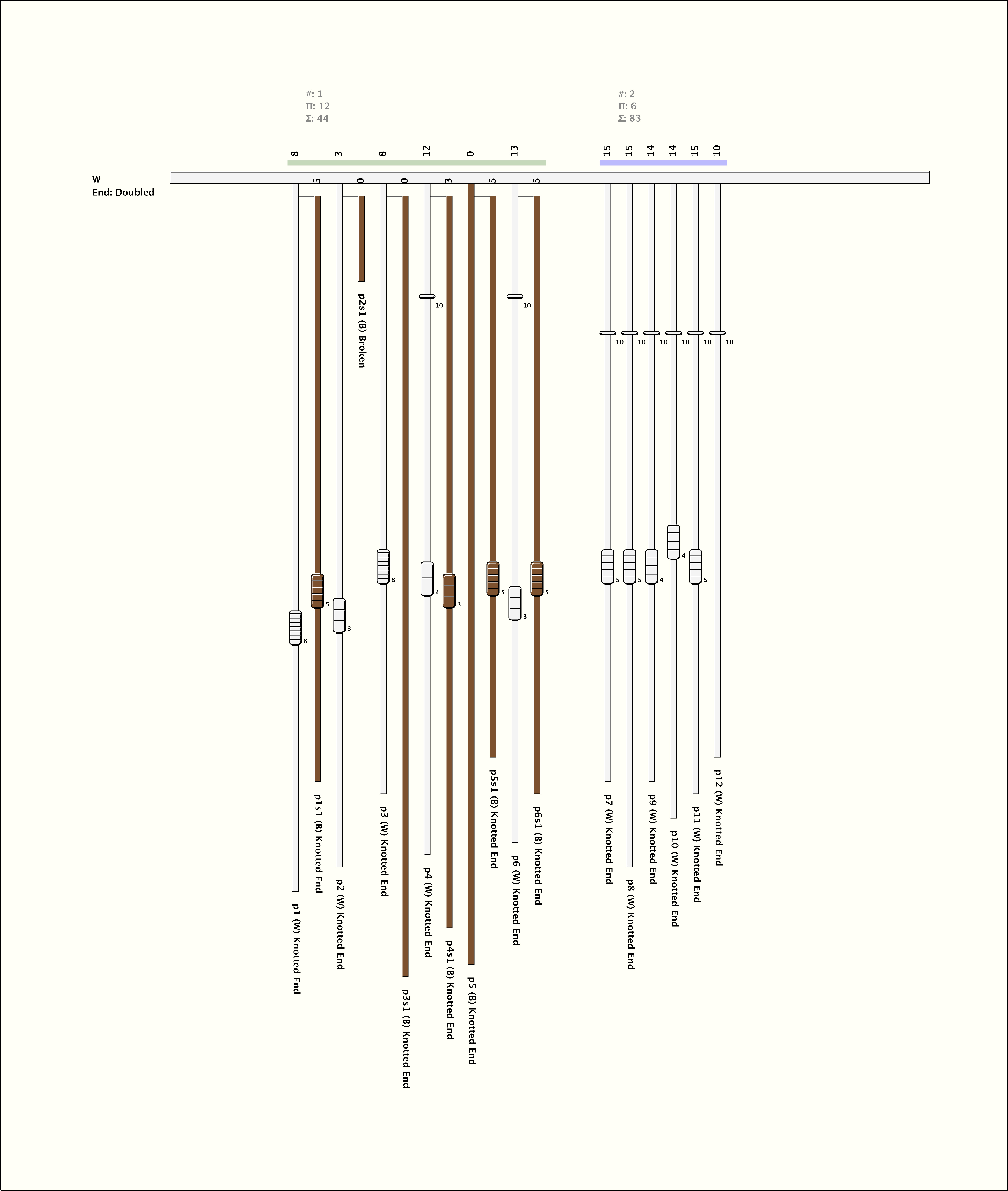 - By spacing, there are 2 groups of 6 pendants each. All pendants and the main cord are color W. There is one subsidiary on each pendant in the first group. All subsidiaries are B.