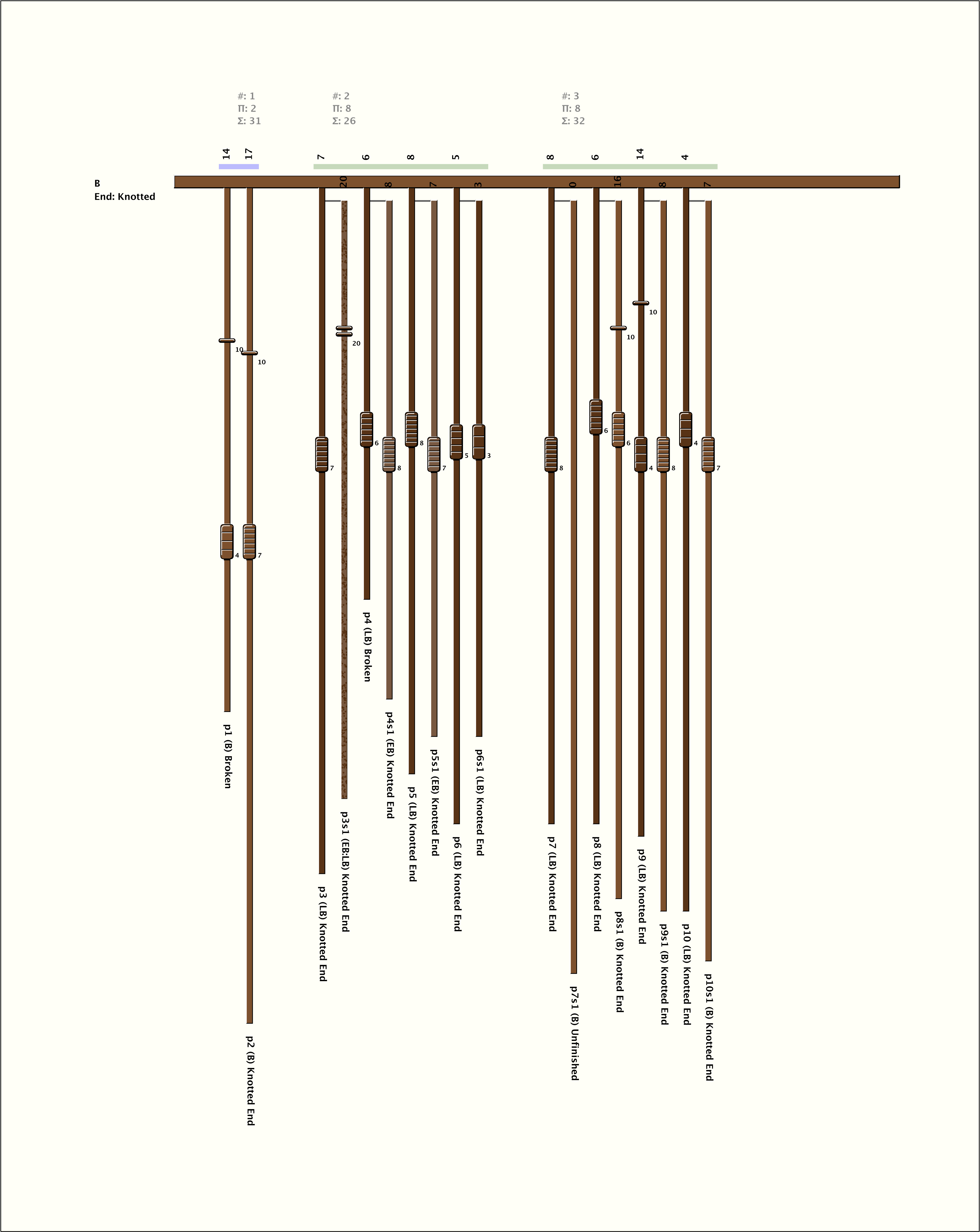- By spacing, the khipu is separated into three groups of 2, 4, 4 pendants. Both pendants in the first group are color B. Each pendant in the next two groups is color LB with one subsidiary. The subsidiaries in the first of these two groups are LB, EB, or LB and EB mottled; in the second of these two groups they are all color B.