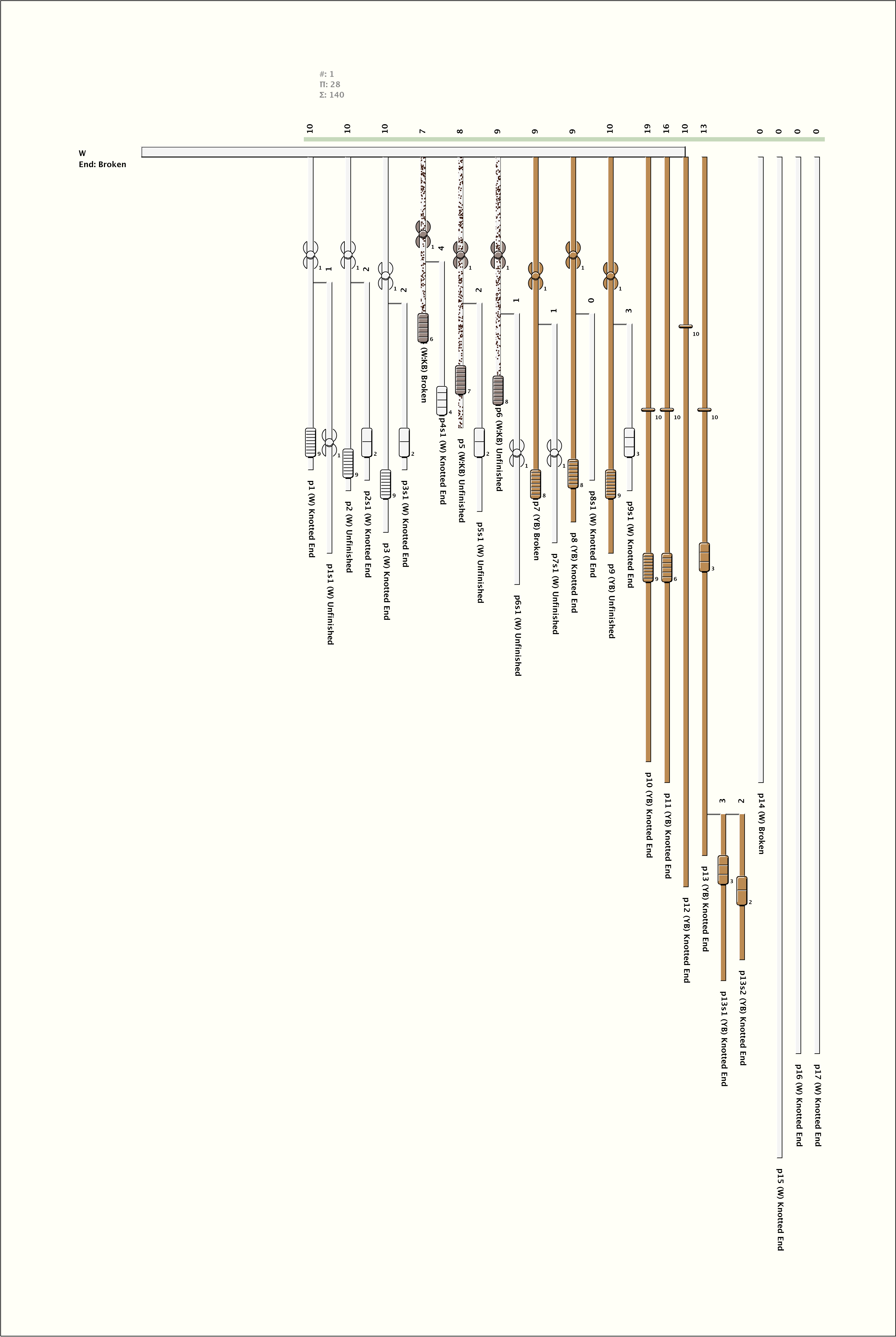 - By color, subsidiary placement, and knot form the khipu is in two parts. The first part consists of 3 groups of 3 pendants each. Each of these nine pendants has 1 white subsidiary and two positions of unit knots. The pendants are associated into groups by color: 3 W, 3 KB:W, 3 YB. The second part consists of 4 pendants of color YB with values 10-19 followed by 4 pendants of color W all with value 0.