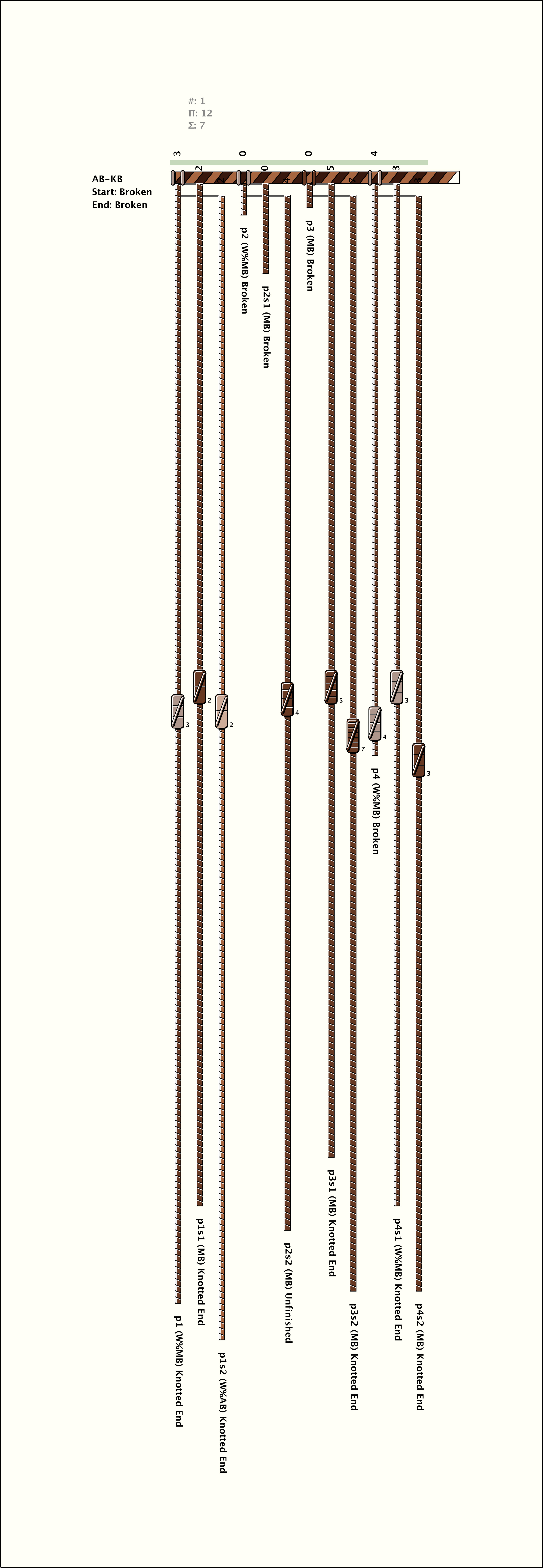 Total Number of Cords: 12 Number of Ascher Cord Colors: 4 Similar Khipu: Previous (UR1033E) Next (UR109) Catalog: HP016 Khipu Notes: |