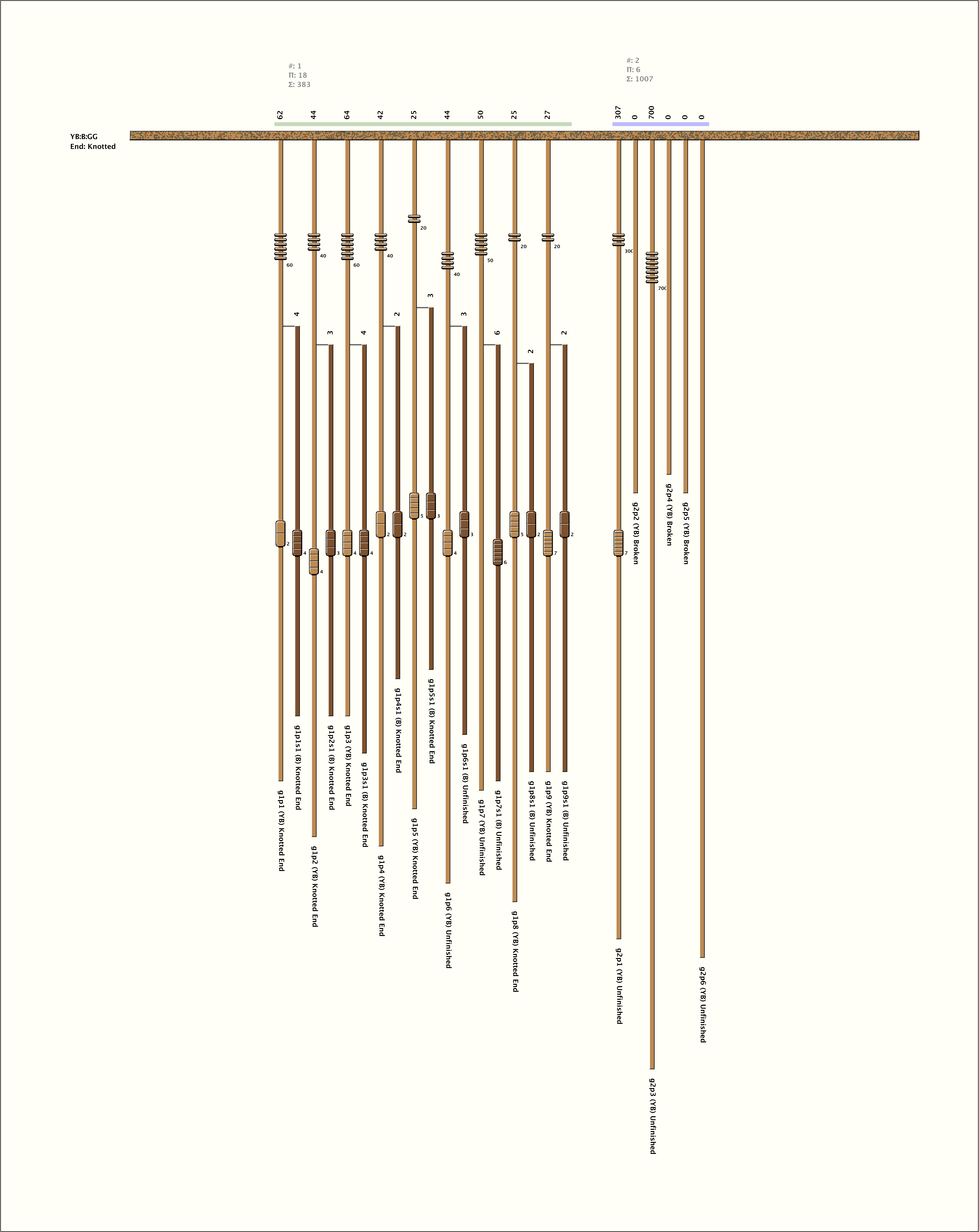 # of Groups & Cords: 2 Groups, 24 Cords - (15p, 9s) # of Ascher Cord Colors: 3 Similar Khipu: Previous (KH0171) Next (KH0148) Catalog: KH0012 Khipu Notes: Khipu Notes |