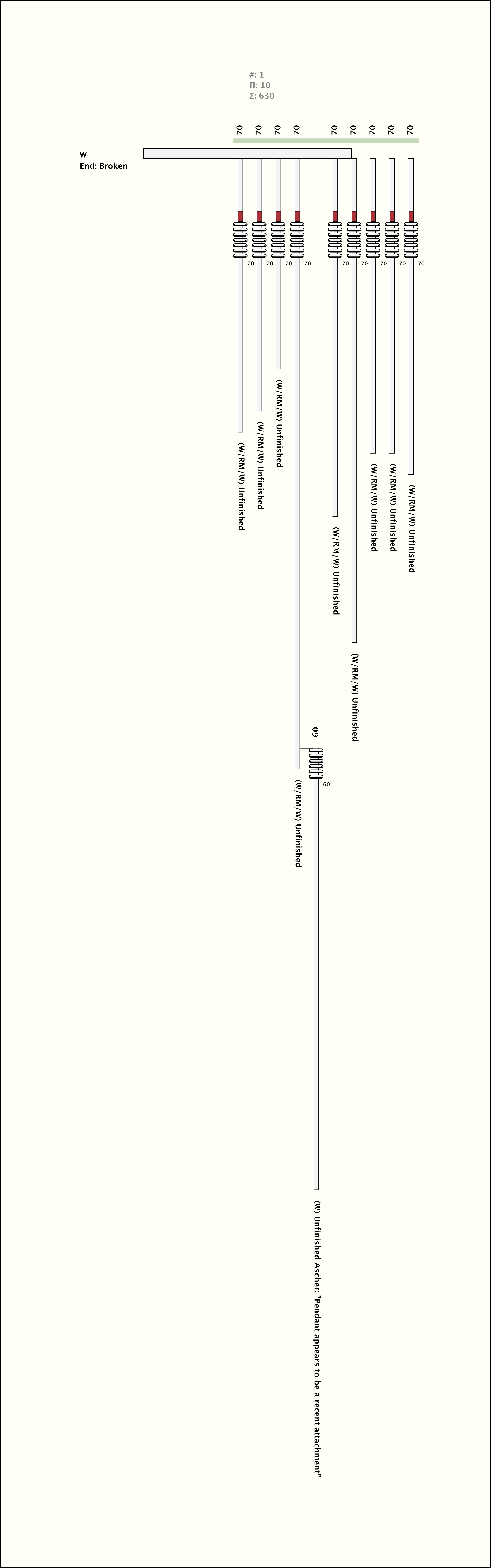 - Construction note: The color designation W/RM refers to a white cord with thin thread wrapped around it. The thread wrapping forms a.5 cm. wide band from 2.5 cm.-3.0 cm.