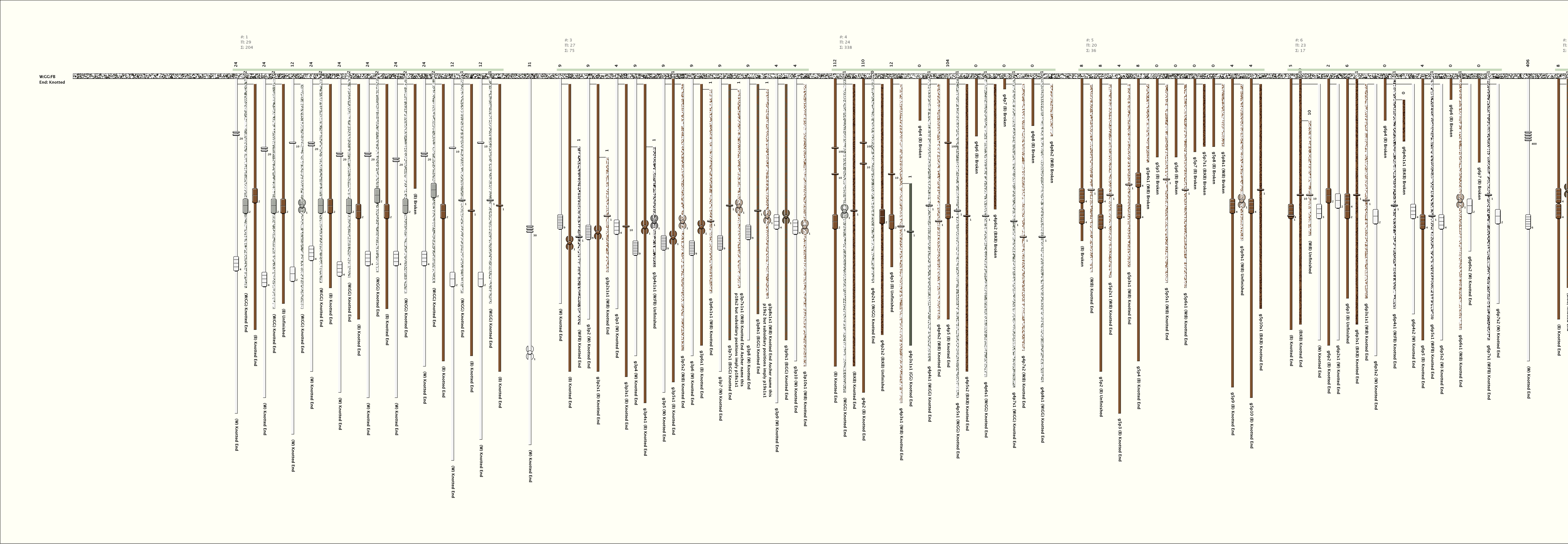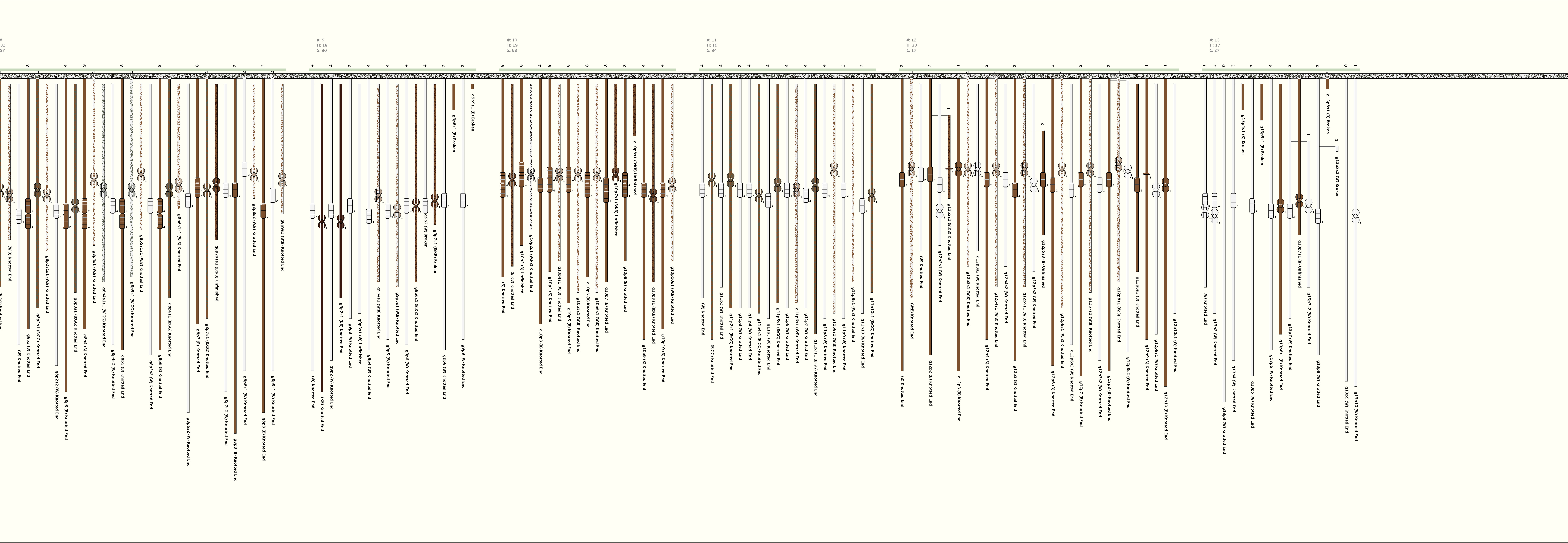 # of Groups & Cords: 13 Groups, 260 Cords - (105p, 155s) # of Ascher Cord Colors: 10 Similar Khipu: Previous (KH0006) Next (KH0204) Catalog: KH0028 Khipu Notes: Khipu Notes |
