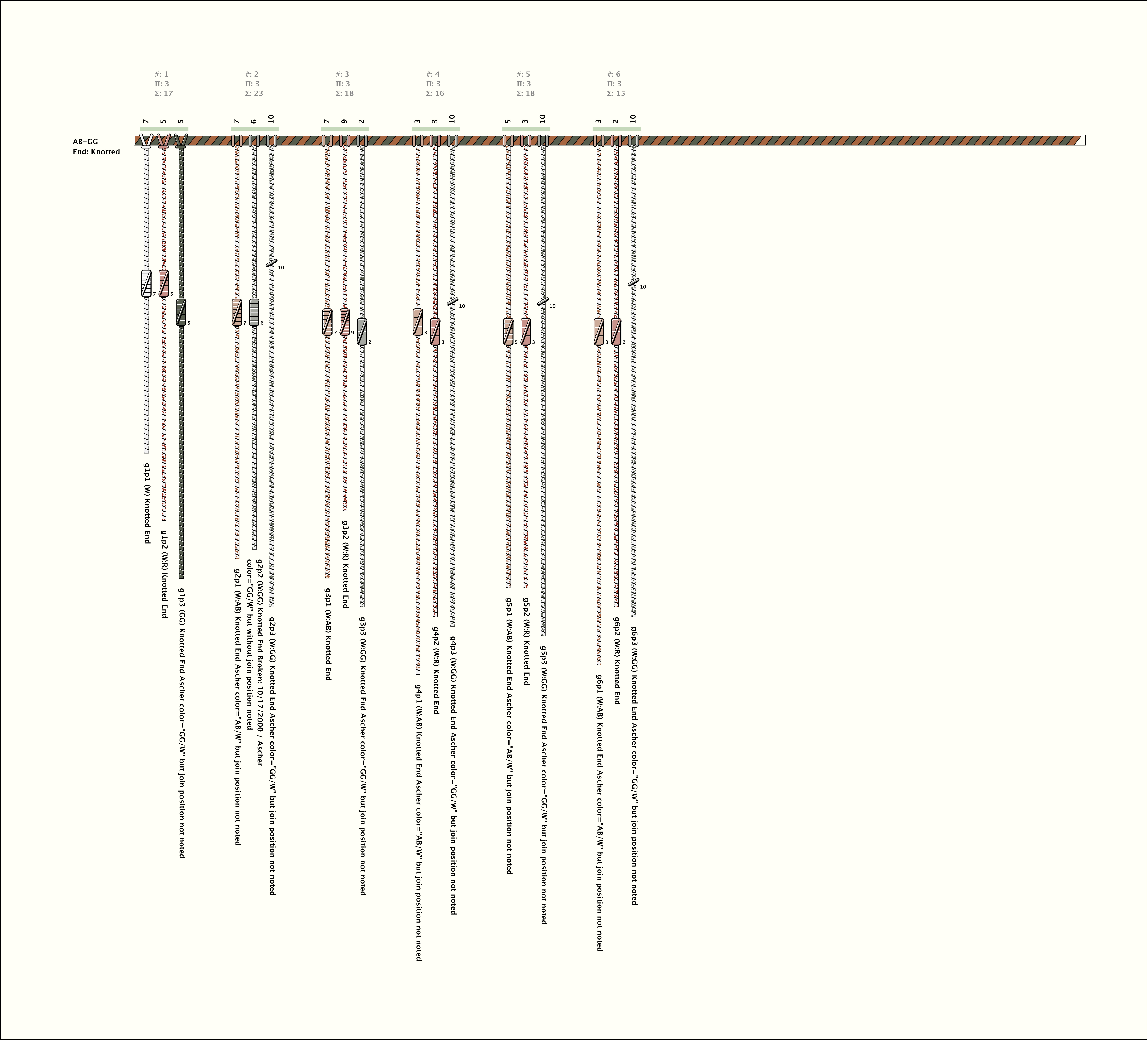 - This khipu has 6 groups of 3 pendants each by spacing . With the exception of the first pendant in group 1, the colors are consistent with position in group : AB/W, R/W, GG/W.