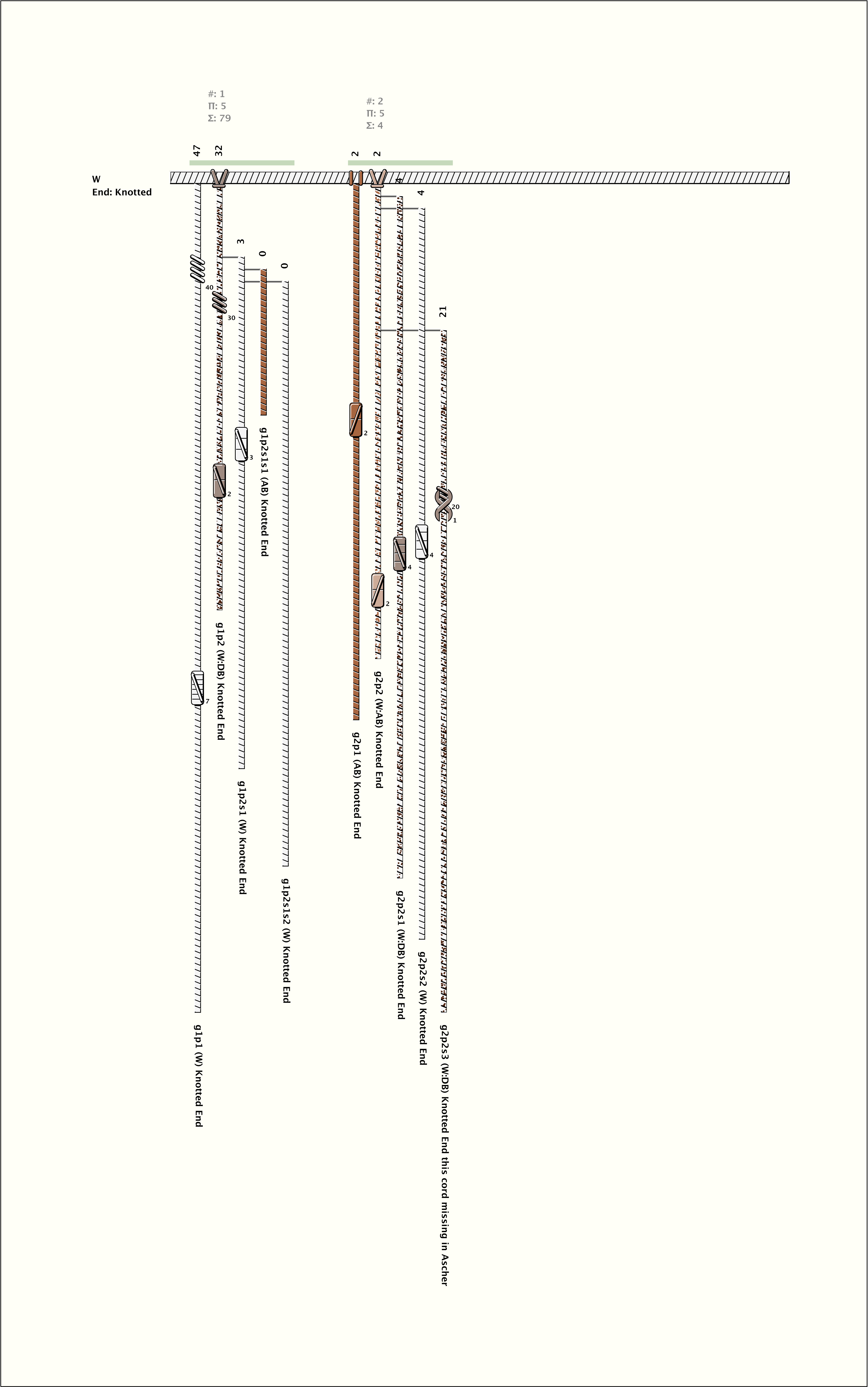 # of Groups & Cords: 2 Groups, 10 Cords - (4p, 6s) # of Ascher Cord Colors: 4 Similar Khipu: Previous (KH0573) Next (KH0683) Catalog: KH0039 Khipu Notes: Khipu Notes |