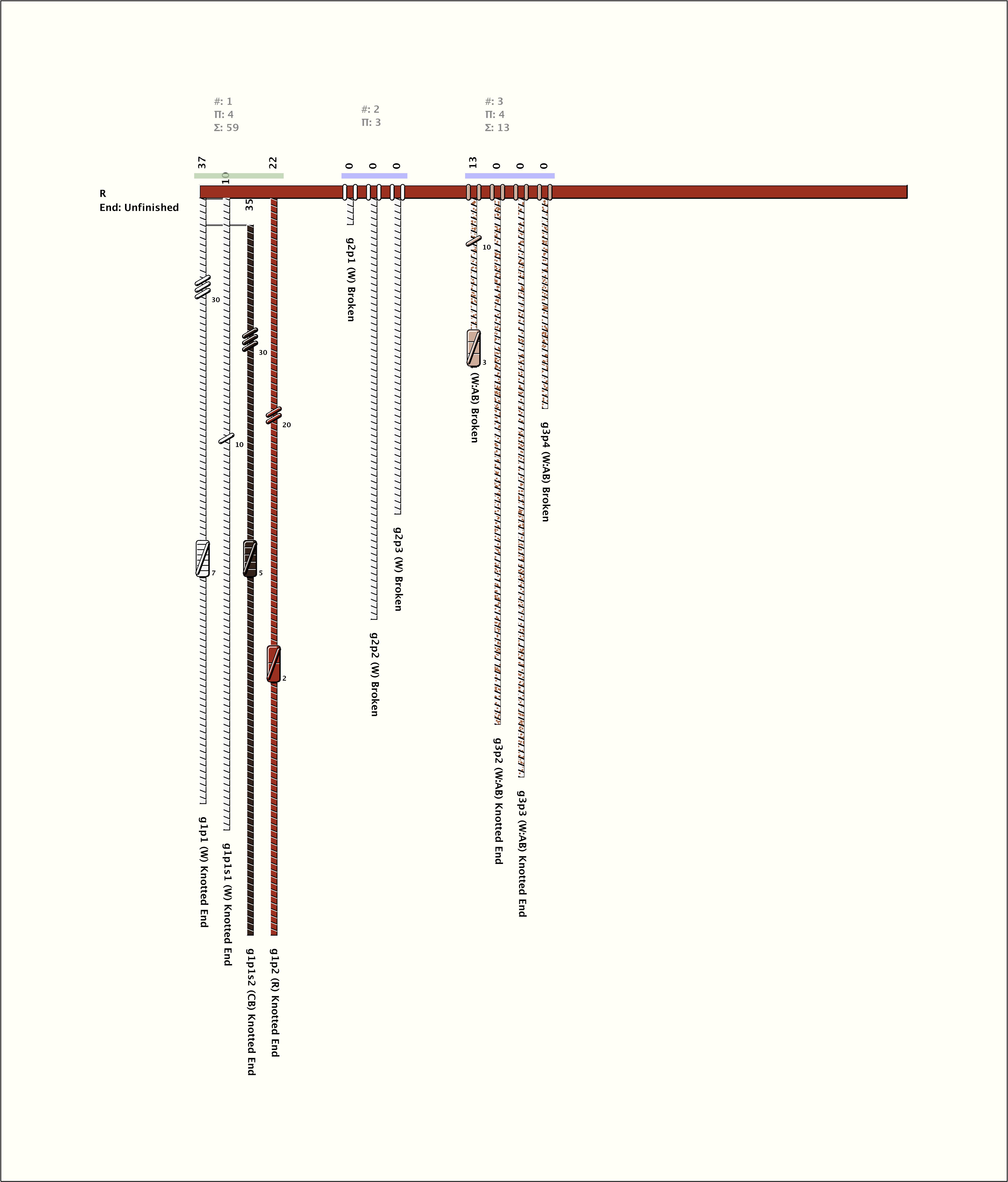 # of Groups & Cords: 3 Groups, 11 Cords - (9p, 2s) # of Ascher Cord Colors: 4 Similar Khipu: Previous (KH0033) Next (KH0496) Catalog: KH0041 Khipu Notes: Khipu Notes |