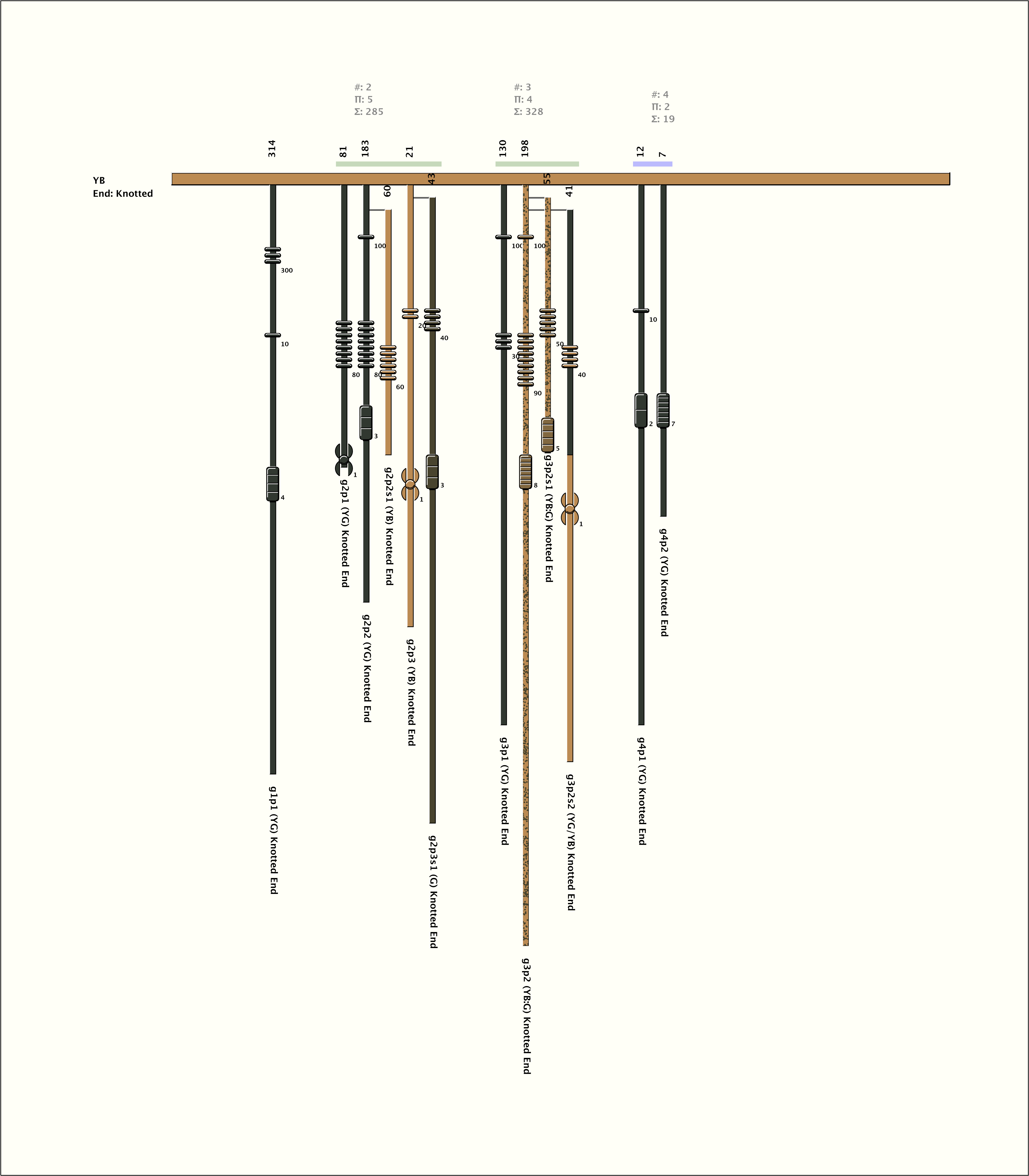 # of Groups & Cords: 4 Groups, 12 Cords - (8p, 4s) # of Ascher Cord Colors: 4 Similar Khipu: Previous (KH0015) Next (KH0189) Catalog: KH0045 Khipu Notes: Khipu Notes |