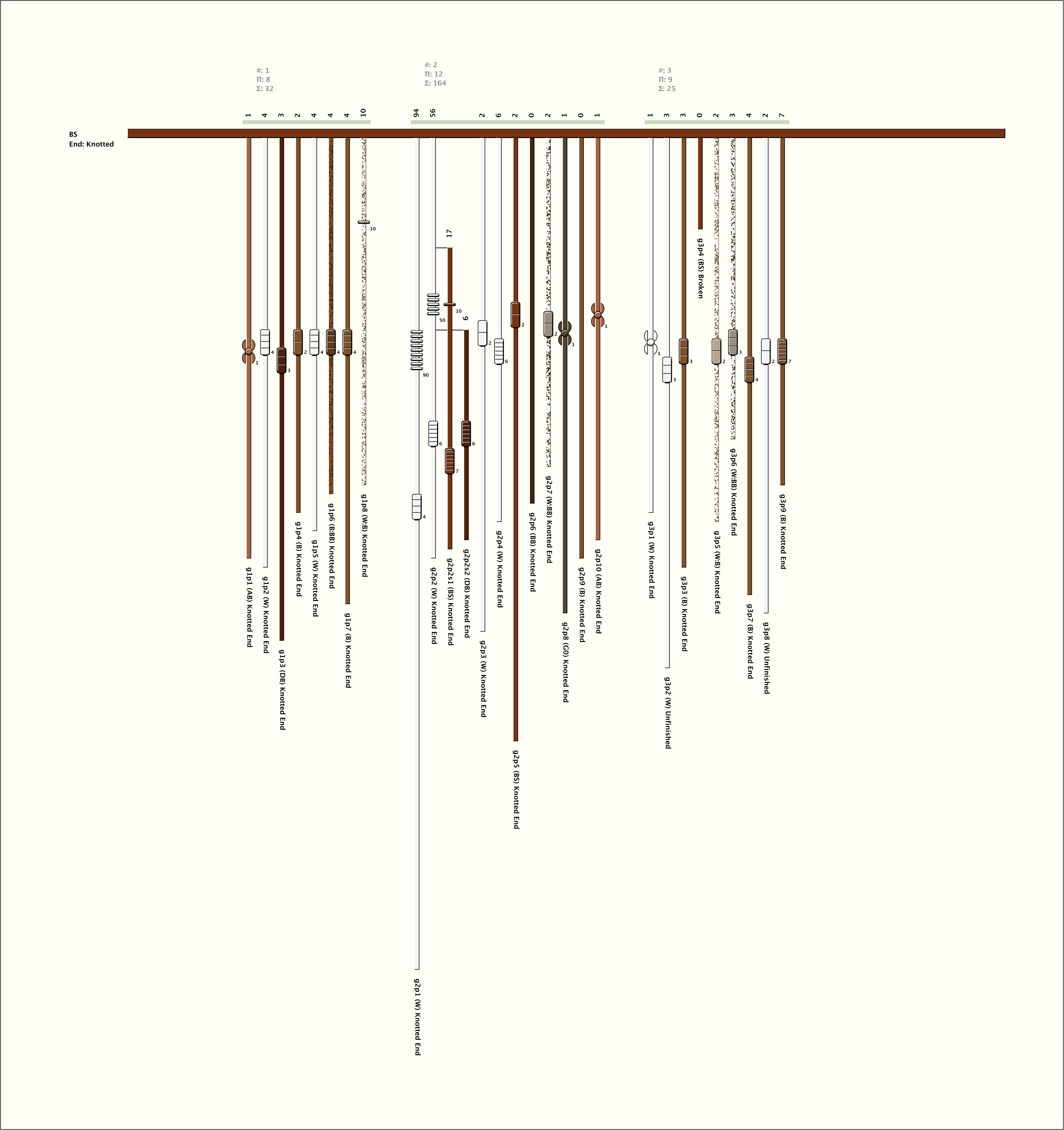 # of Groups & Cords: 3 Groups, 29 Cords - (27p, 2s) # of Ascher Cord Colors: 10 Similar Khipu: Previous (KH0180) Next (RA008) Catalog: KH0054 Khipu Notes: Khipu Notes |