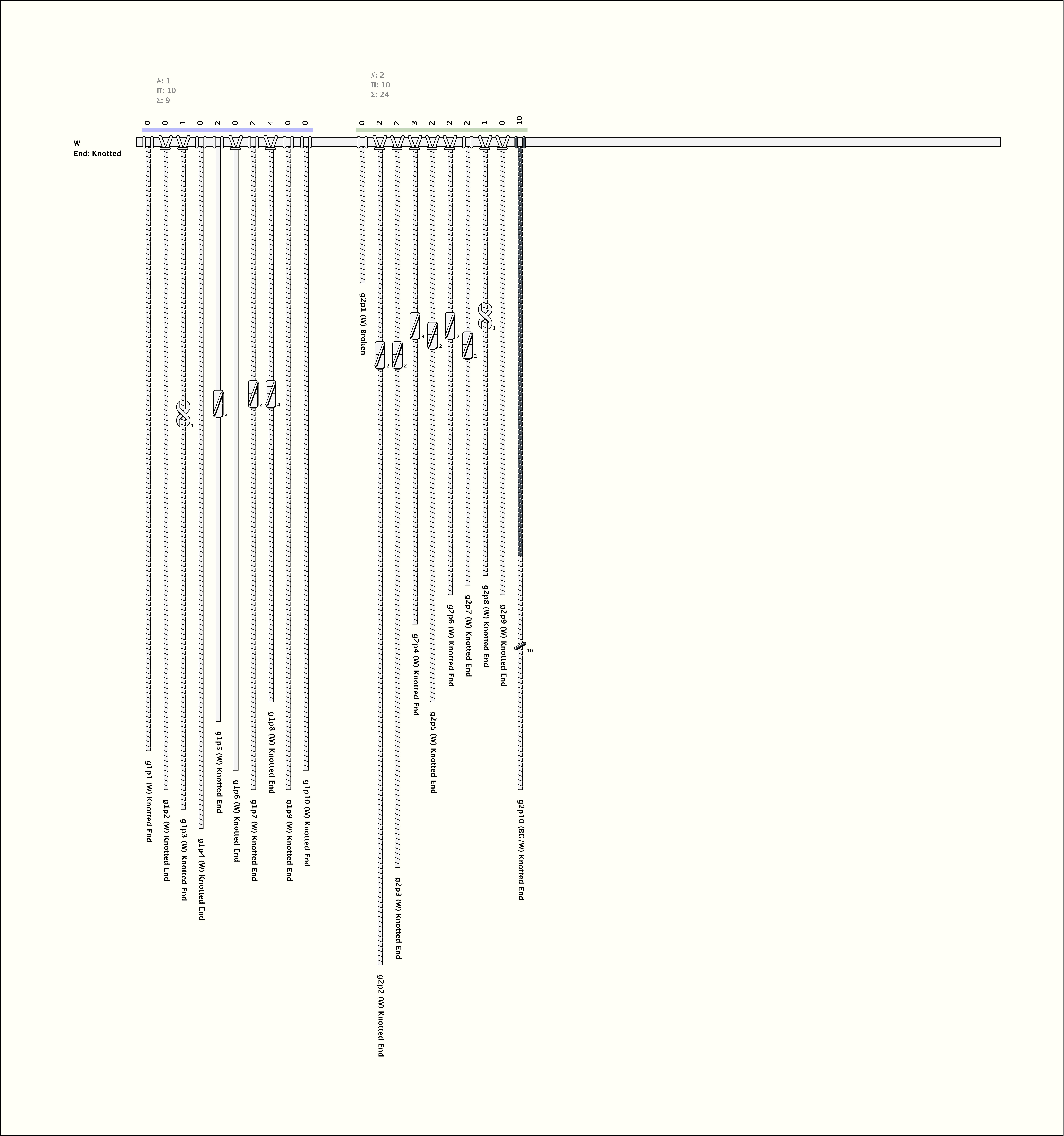 # of Groups & Cords: 2 Groups, 20 Cords - 20p # of Ascher Cord Colors: 2 Similar Khipu: Previous (KH0670) Next (KH0589) Catalog: KH0064 Khipu Notes: Khipu Notes |