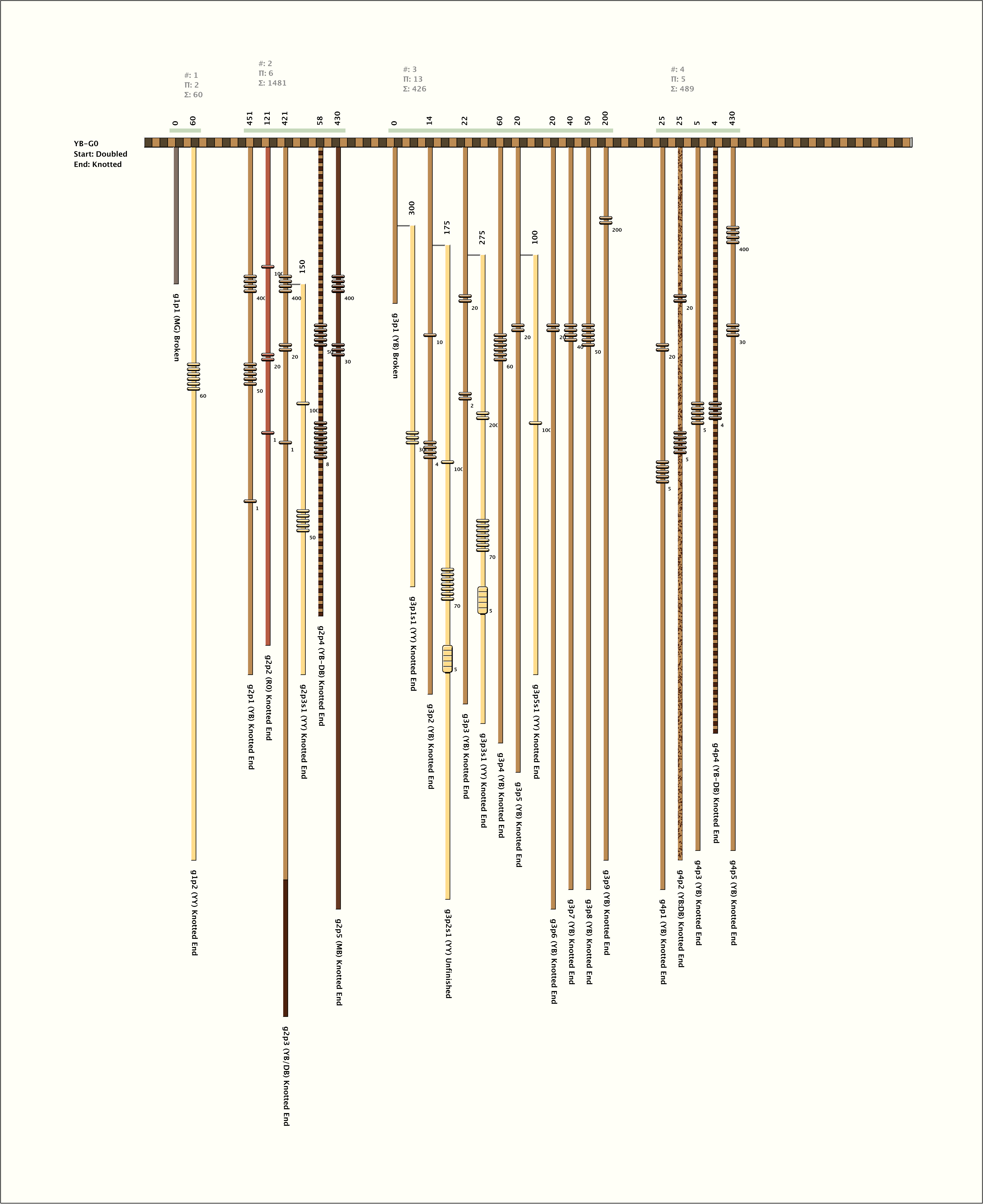 # of Groups & Cords: 4 Groups, 26 Cords - (21p, 5s) # of Ascher Cord Colors: 9 Similar Khipu: Previous (KH0053) Next (KH0021) Catalog: KH0065 Khipu Notes: Khipu Notes |