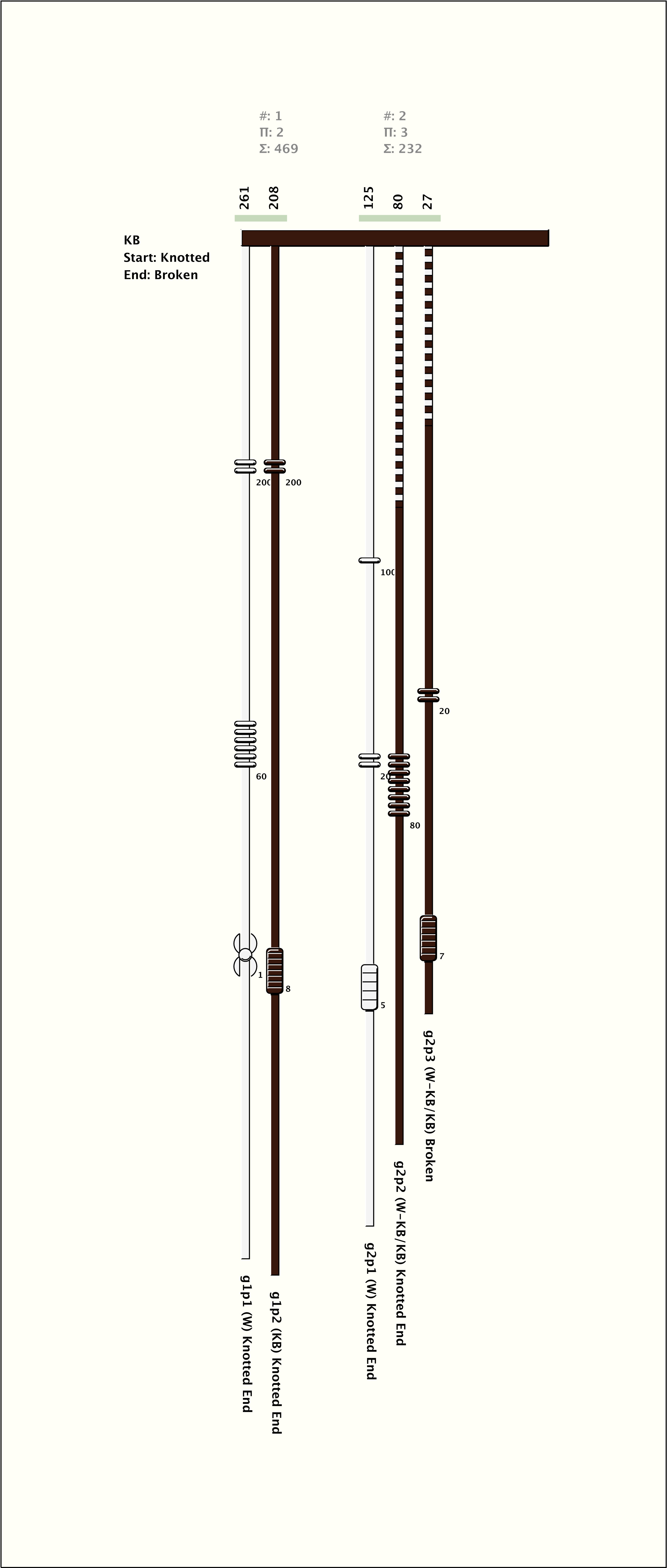 # of Groups & Cords: 2 Groups, 5 Cords - 5p # of Ascher Cord Colors: 3 Similar Khipu: Previous (KH0153) Next (KH0044) Catalog: KH0077 Khipu Notes: Khipu Notes |