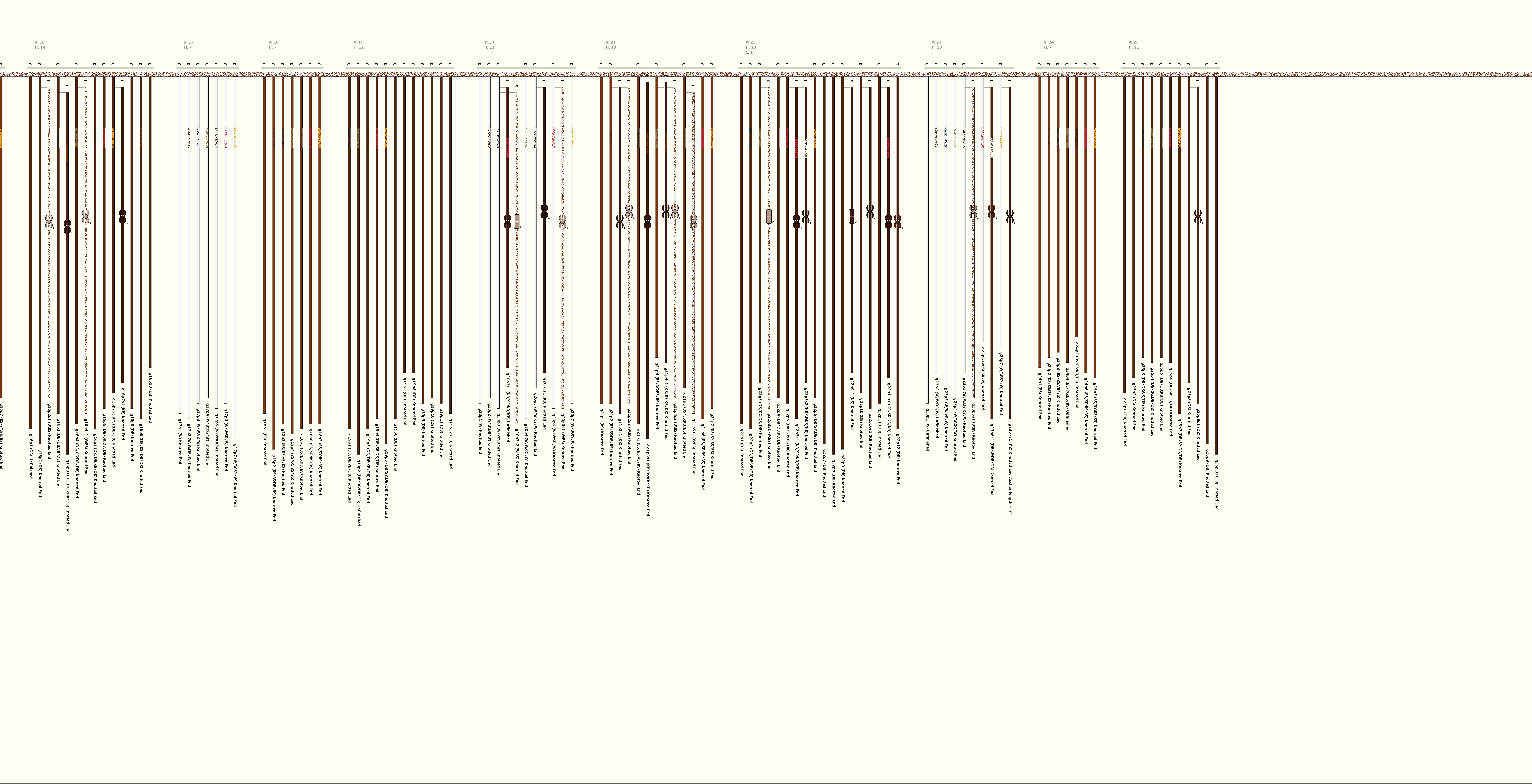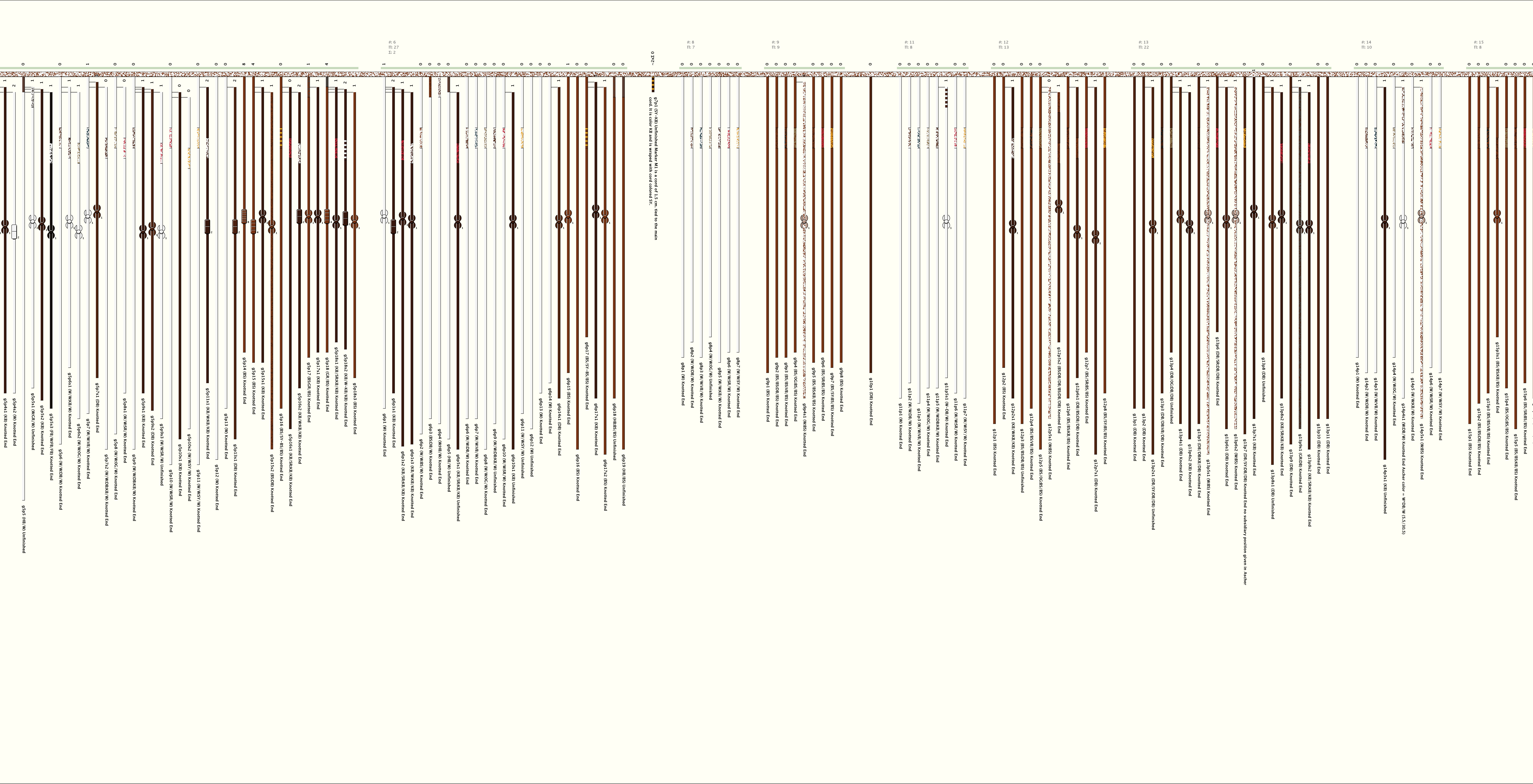 # of Groups & Cords: 25 Groups, 405 Cords - (252p, 153s) # of Ascher Cord Colors: 39 Similar Khipu: Previous (KH0078) Next (KH0208) Catalog: KH0084 Khipu Notes: |