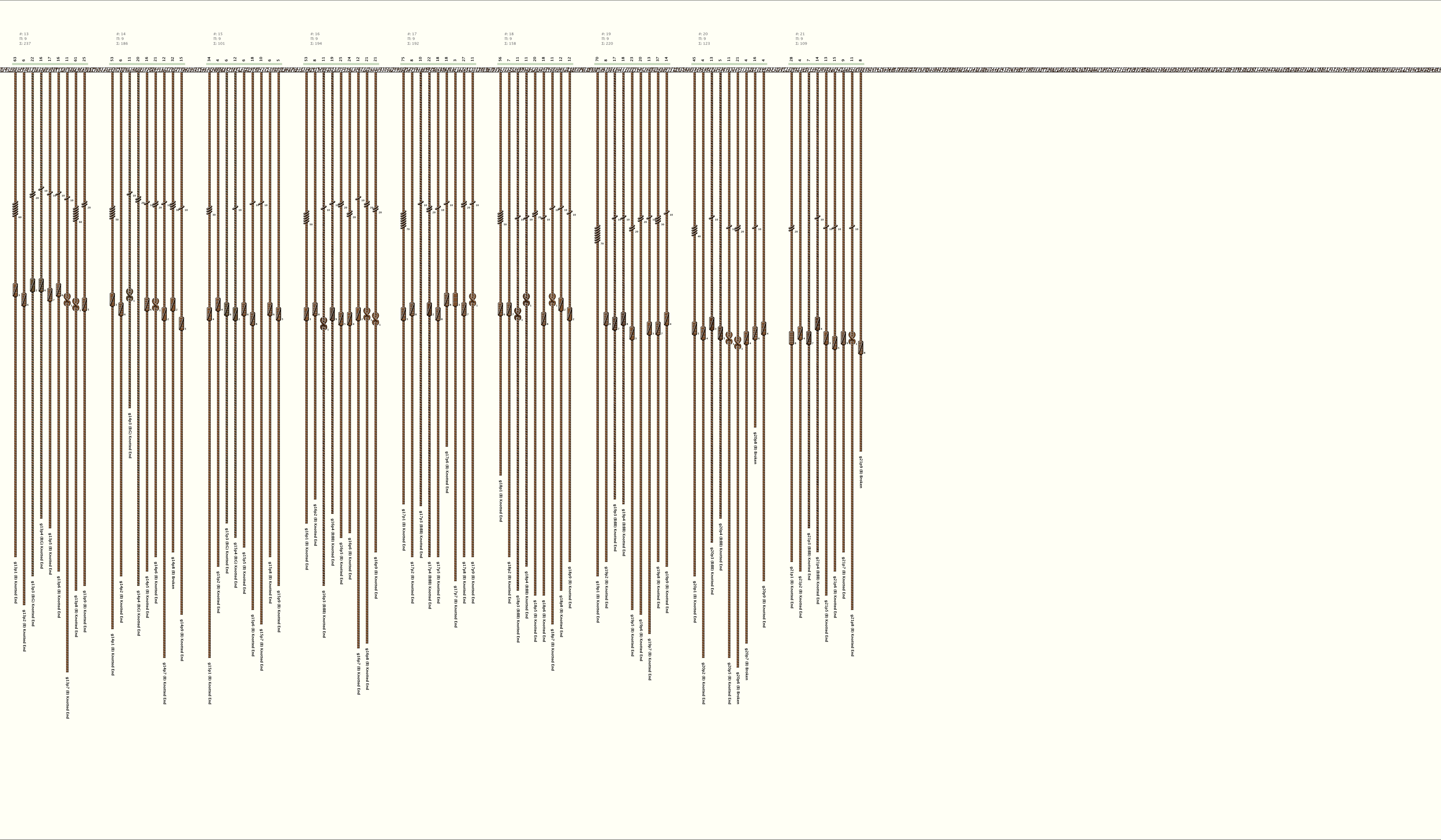 # of Groups & Cords: 21 Groups, 192 Cords - (182p, 10s) # of Ascher Cord Colors: 7 Similar Khipu: Previous (KH0151) Next (KH0120) Catalog: KH0156 Khipu Notes: Khipu Notes |