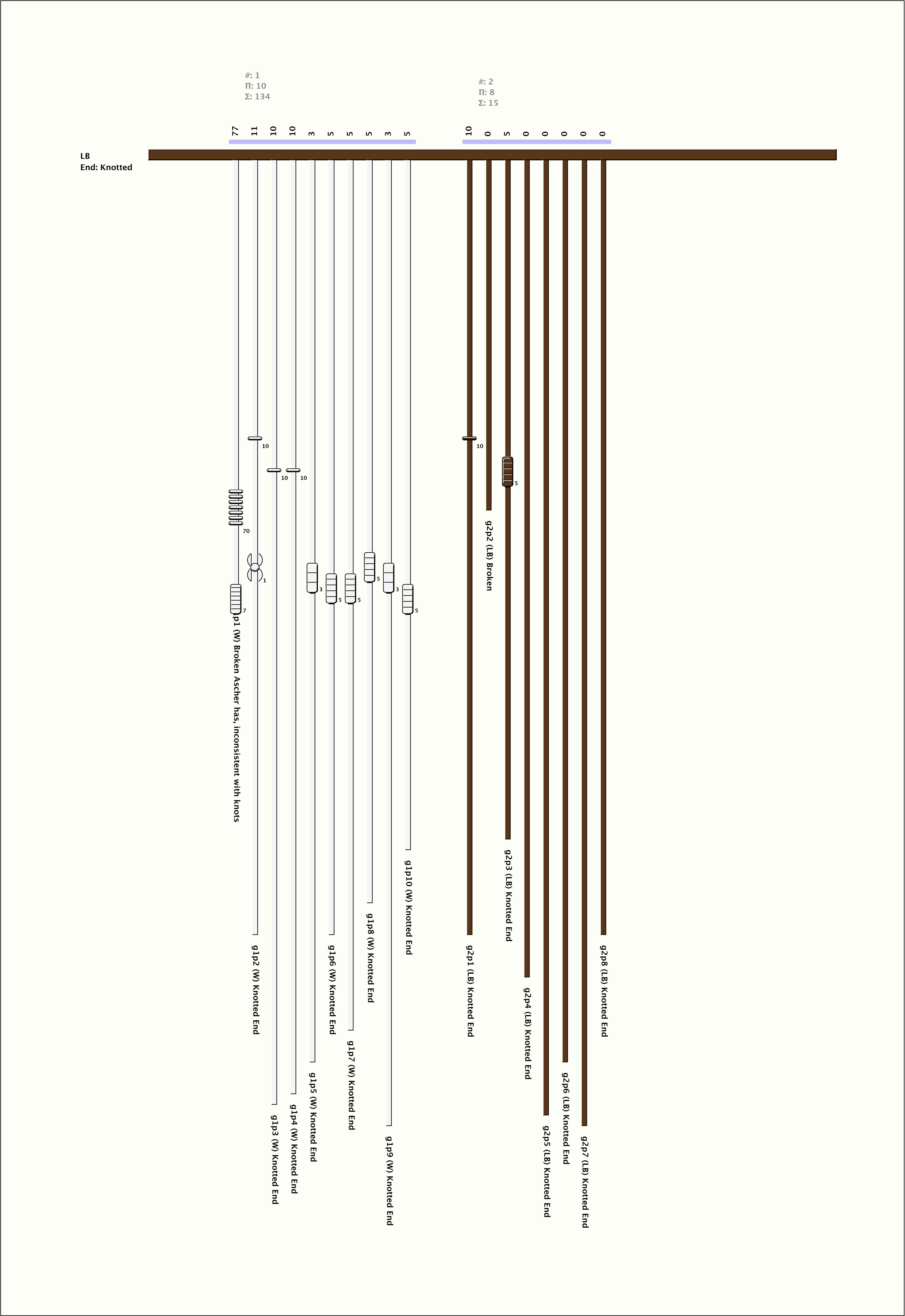 - By spacing, the khipu is separated into 2 groups. All pendants in group 1 are W and all in group 2 are LB.
