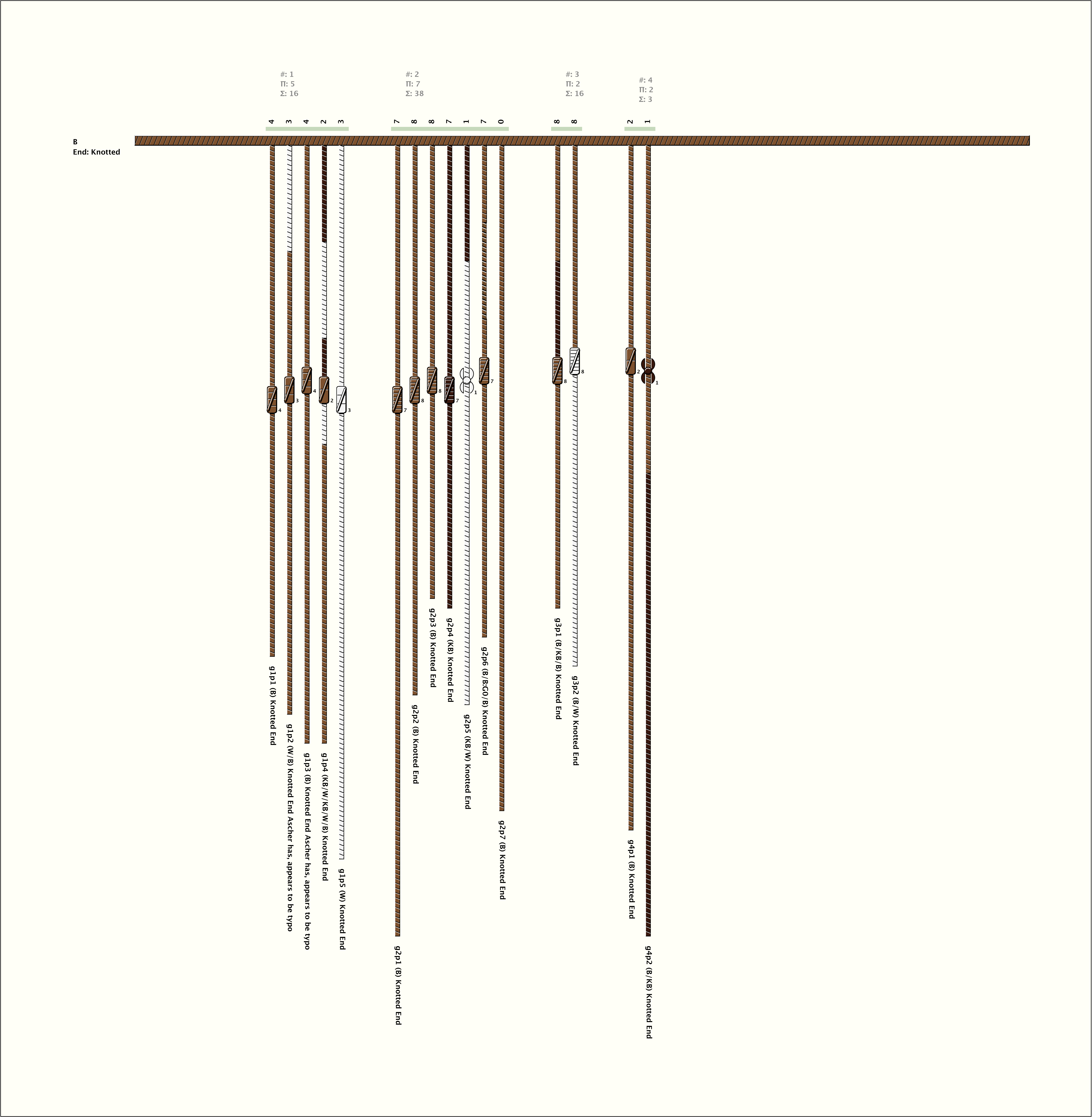 - Construction note: The B main cord is extended by a W main cord. The W main cord is formed into a large loop by being passed through its own twisted end. It has also been passed through the twisted end of the B main cord so that it dangles from the end of the B cord.\
