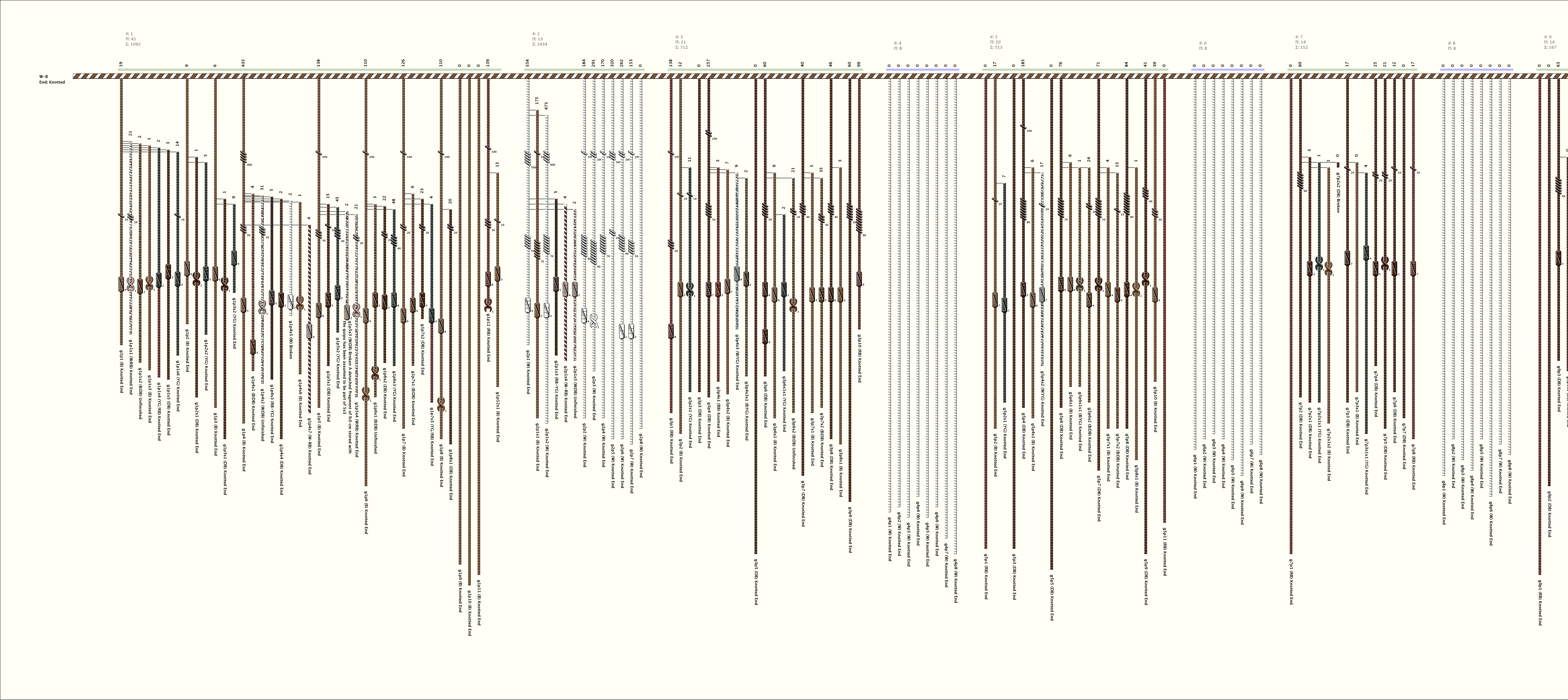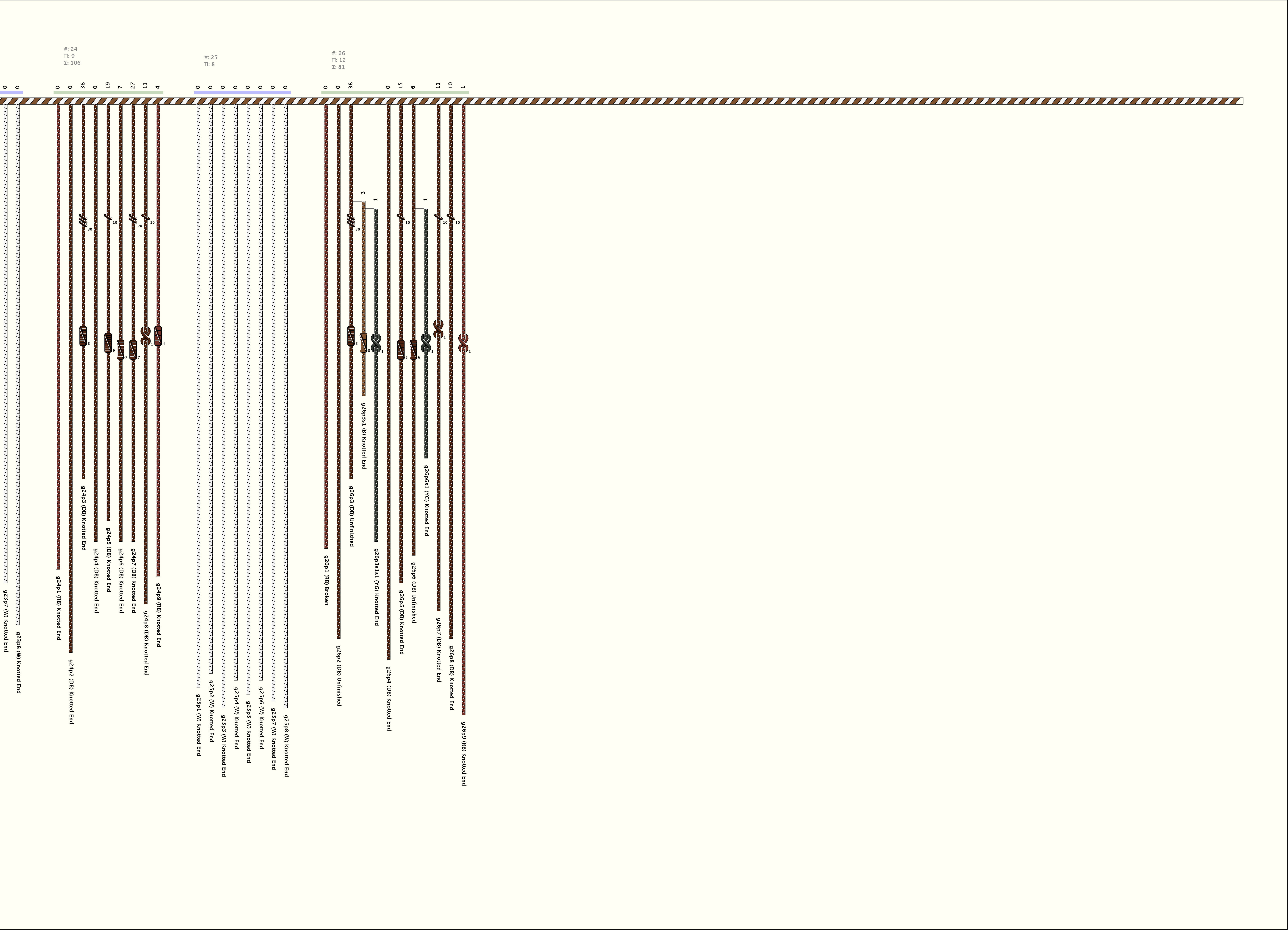 - By color, the khipu is separated in 25 groups. The first group is 12 pendants. Then there are 24 groups alternating in color pattern. Basically the pattern is a group of 8 pendants color W, followed by a group of 9 pendants colored RB, 7 DB, RB. (The exceptions t o the pattern are: groups 3, 5, and 17 each have an additional pendant between positions 1 and 2; groups 5, 7, and 9 each have an additional pendant between positions 8 and 9; in groups 7 and 9, position 4 is non-existent; and in group 7, position 2 is also non-existent. ) Starting with group 4, all groups of W pendants are of value 0 (or blank) and, in the alternate groups, all values in positions 1, 2, and 4 are 0 (or blank).