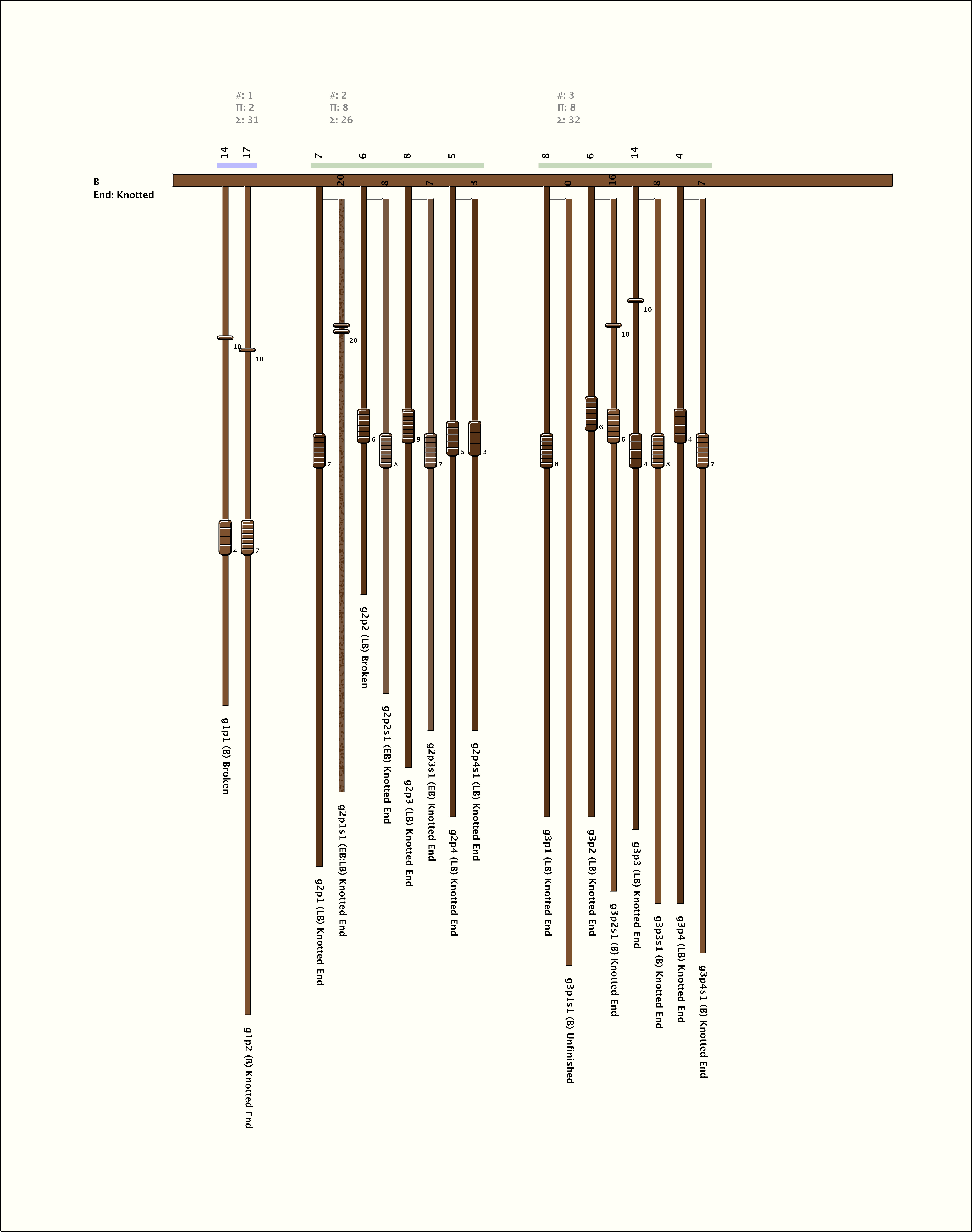 - By spacing, the khipu is separated into three groups of 2, 4, 4 pendants. Both pendants in the first group are color B. Each pendant in the next two groups is color LB with one subsidiary. The subsidiaries in the first of these two groups are LB, EB, or LB and EB mottled; in the second of these two groups they are all color B.