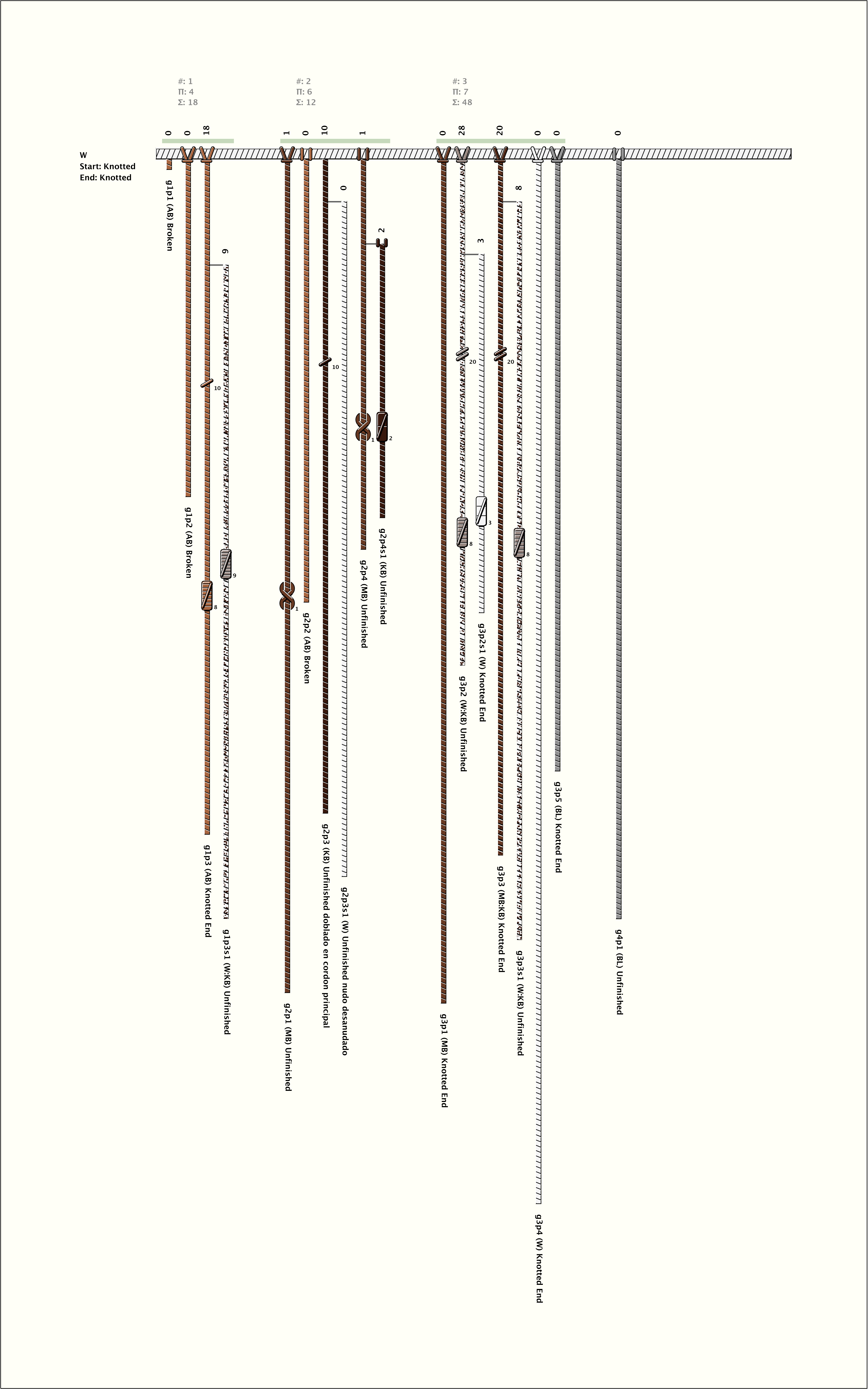 # of Groups & Cords: 4 Groups, 18 Cords - (13p, 5s) # of Ascher Cord Colors: 7 Similar Khipu: Previous (KH0506) Next (KH0257) Catalog: KH0255 Khipu Notes: |