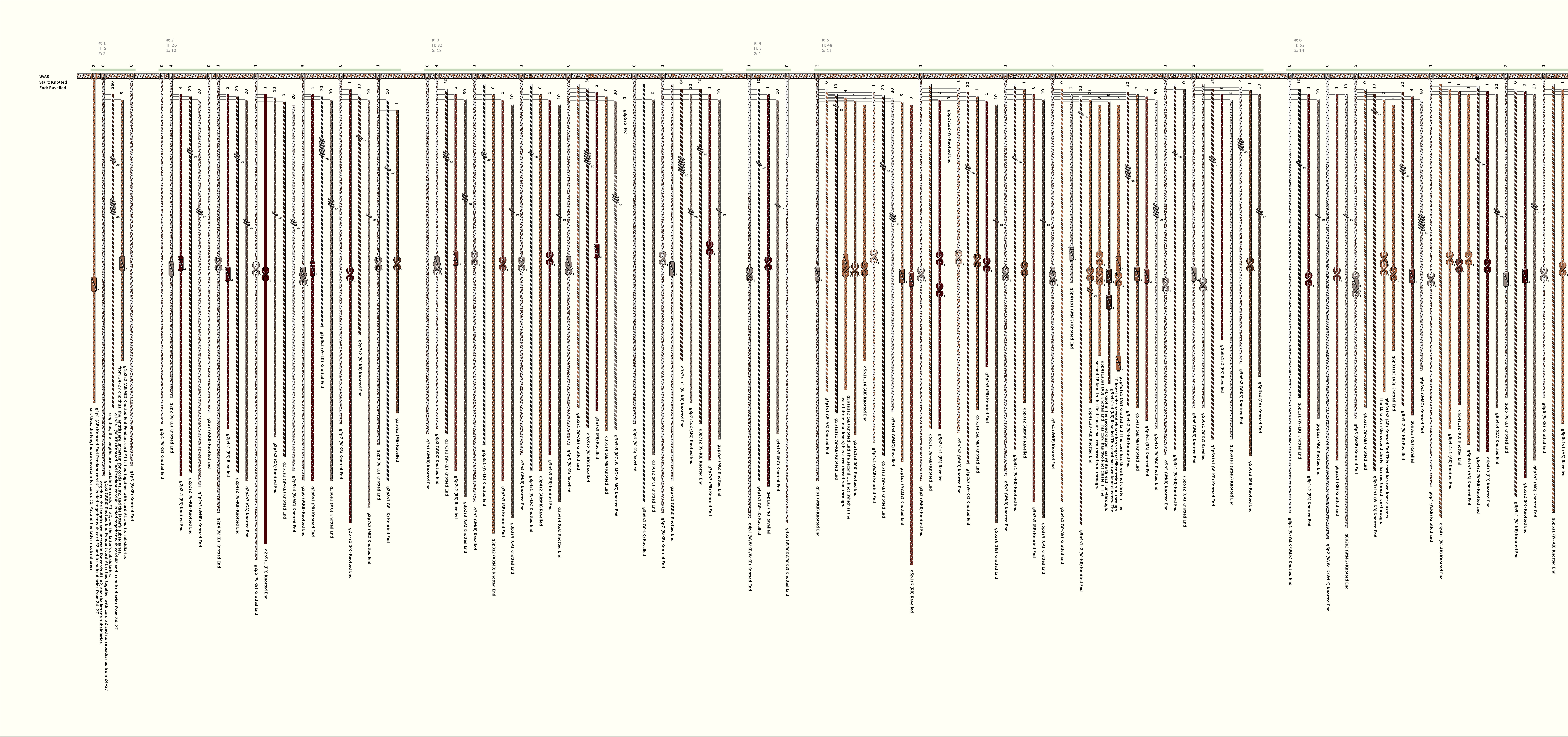 # of Groups & Cords: 9 Groups, 275 Cords - (58p, 217s) # of Ascher Cord Colors: 22 Similar Khipu: Previous (KH0568) Next (KH0295) Catalog: KH0294 Khipu Notes: Khipu Notes |