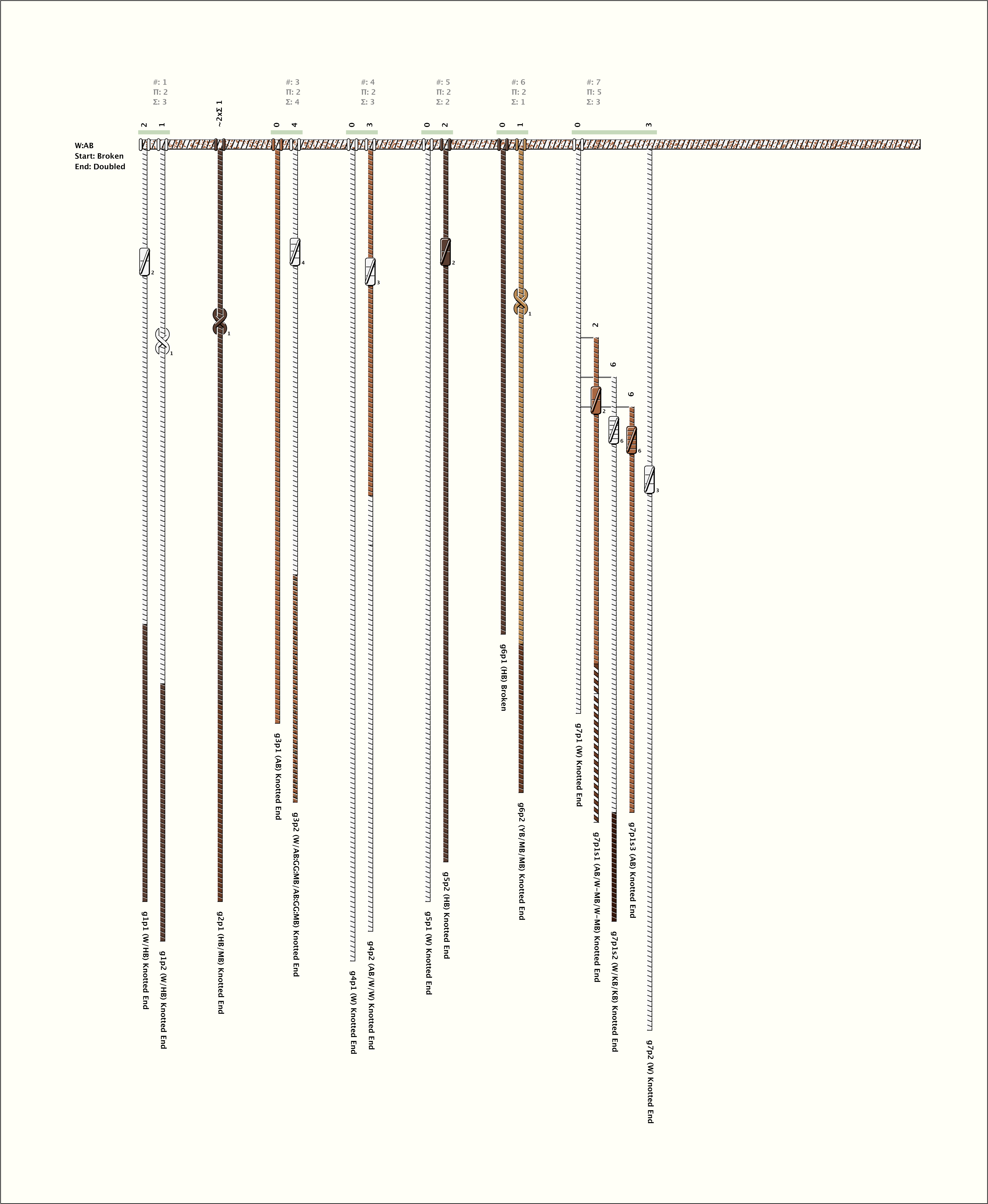 # of Groups & Cords: 7 Groups, 16 Cords - (13p, 3s) # of Ascher Cord Colors: 9 Similar Khipu: Previous (KH0663) Next (KH0038) Catalog: KH0354 Khipu Notes: Khipu Notes |
