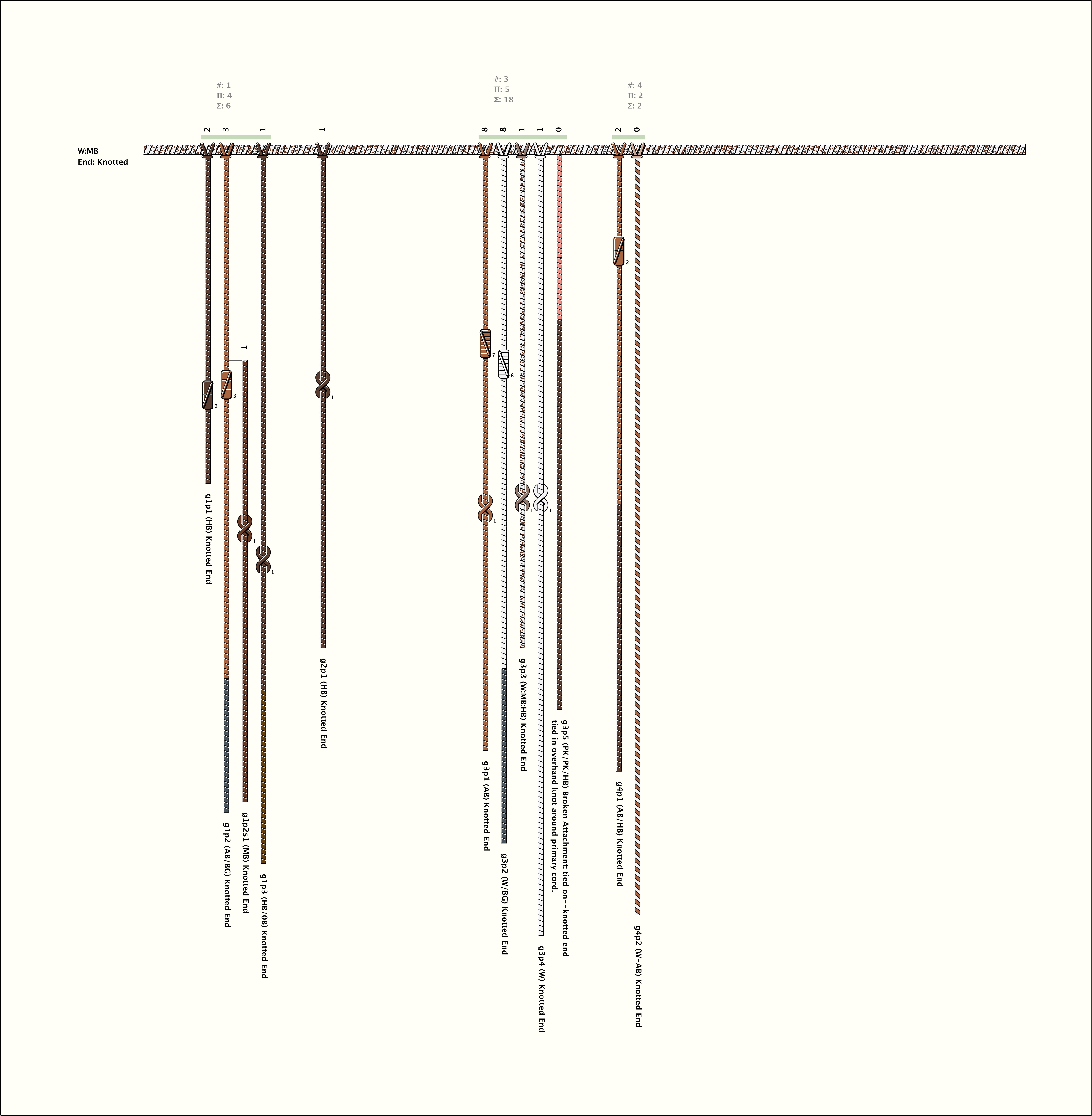 # of Groups & Cords: 4 Groups, 12 Cords - (11p, 1s) # of Ascher Cord Colors: 10 Similar Khipu: Previous (KH0424) Next (KH0694) Catalog: KH0355 Khipu Notes: Khipu Notes |