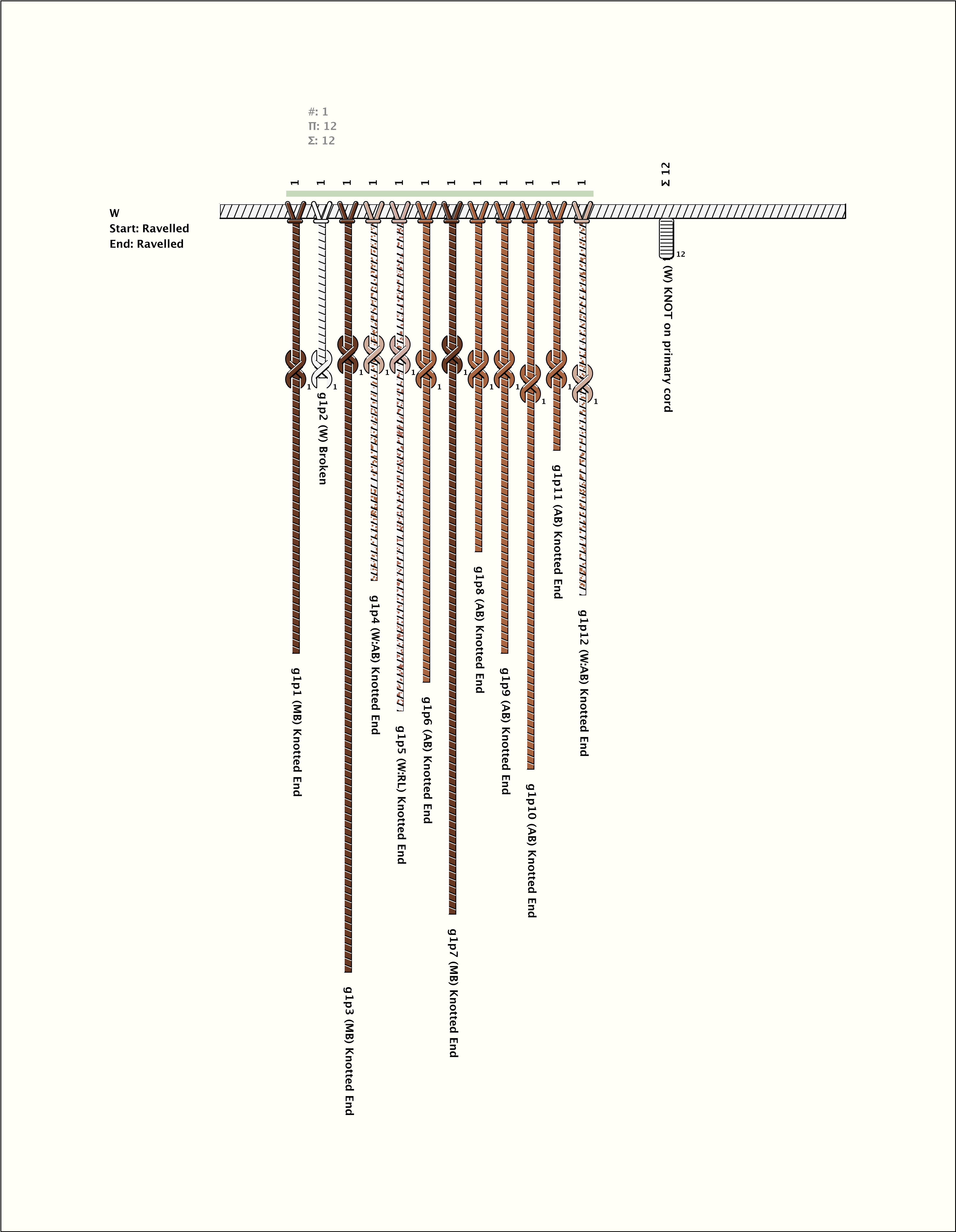 # of Groups & Cords: 2 Groups, 13 Cords - 13p # of Ascher Cord Colors: 5 Similar Khipu: Previous (KH0262) Next (KH0412) Catalog: KH0374 Khipu Notes: |