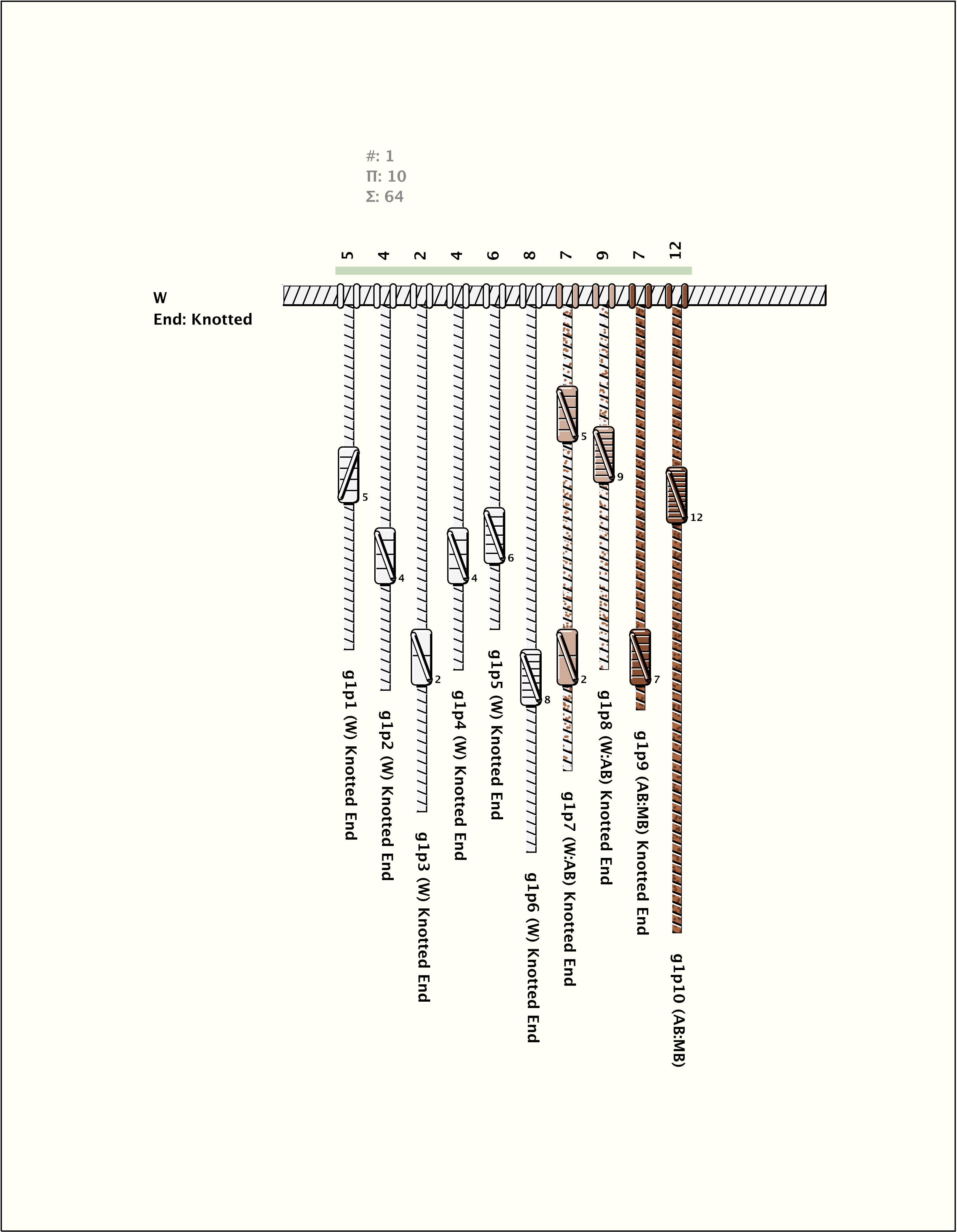 # of Groups & Cords: 1 Groups, 10 Cords - 10p # of Ascher Cord Colors: 3 Similar Khipu: Previous (KH0211) Next (KH0606C) Catalog: KH0397 Khipu Notes: Khipu Notes |