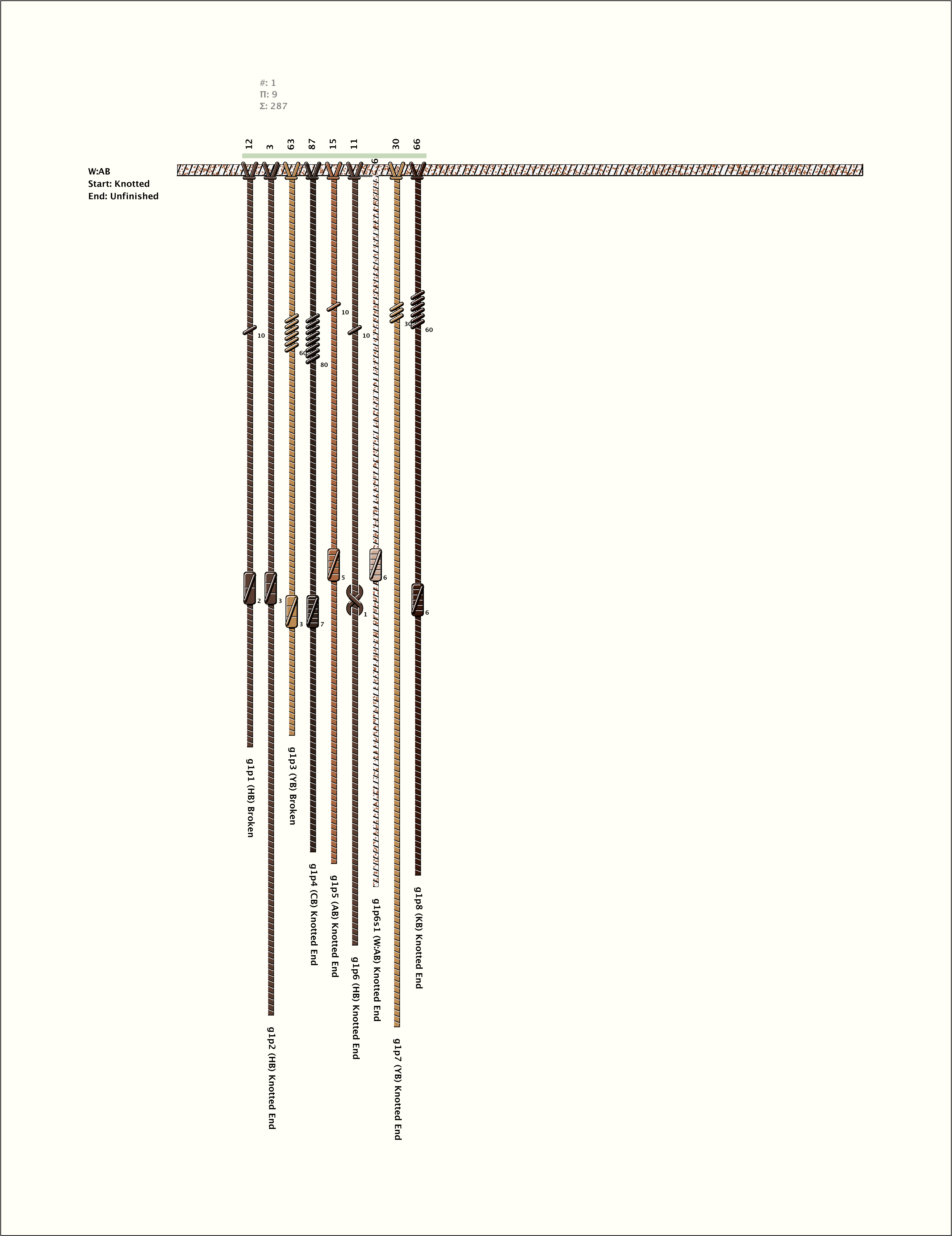 # of Groups & Cords: 1 Groups, 9 Cords - (8p, 1s) # of Ascher Cord Colors: 6 Similar Khipu: Previous (KH0400) Next (KH0298) Catalog: KH0413 Khipu Notes: |