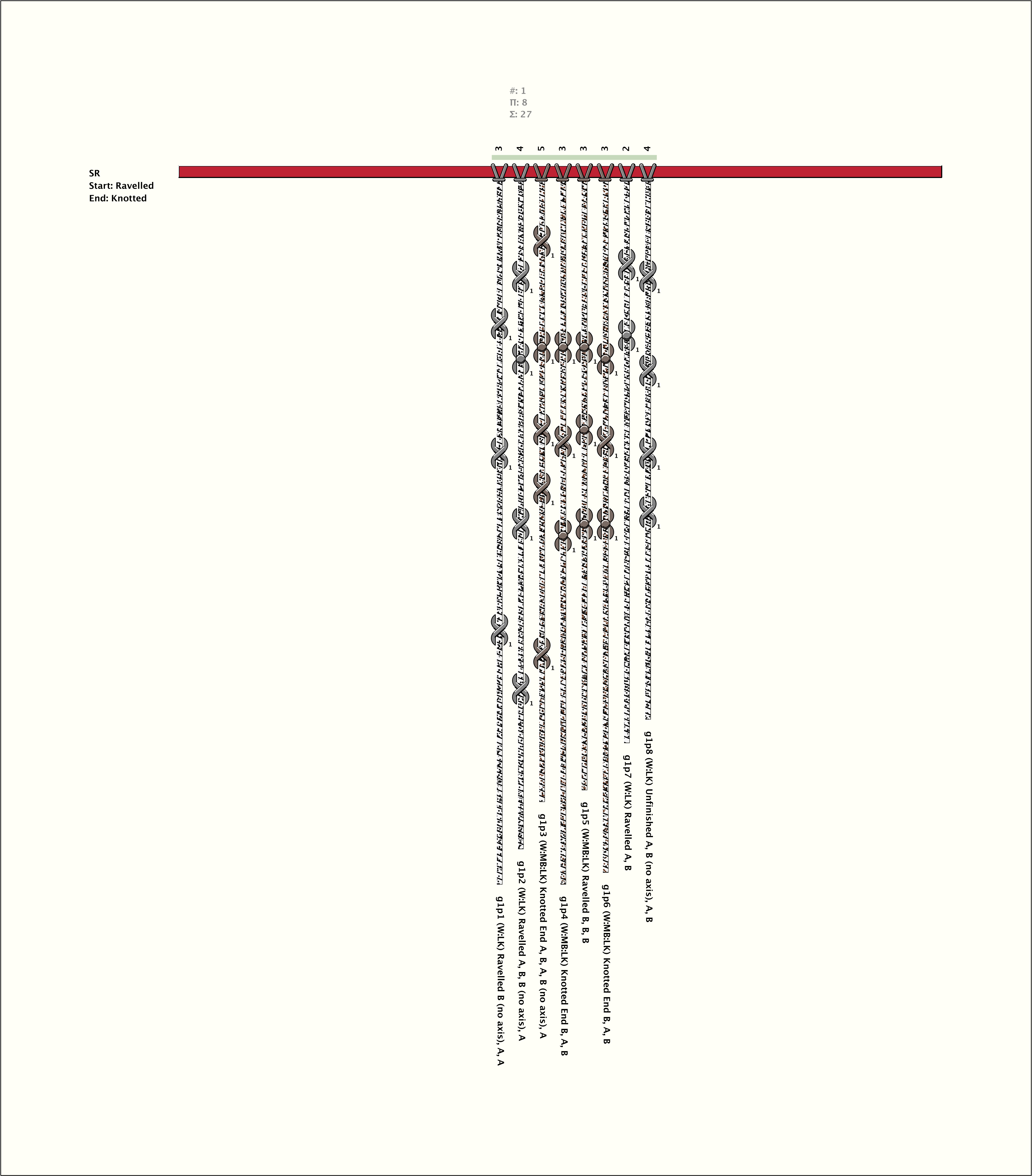 # of Groups & Cords: 1 Groups, 8 Cords - 8p # of Ascher Cord Colors: 3 Similar Khipu: Previous (KH0694) Next (KH0262) Catalog: KH0419 Khipu Notes: |