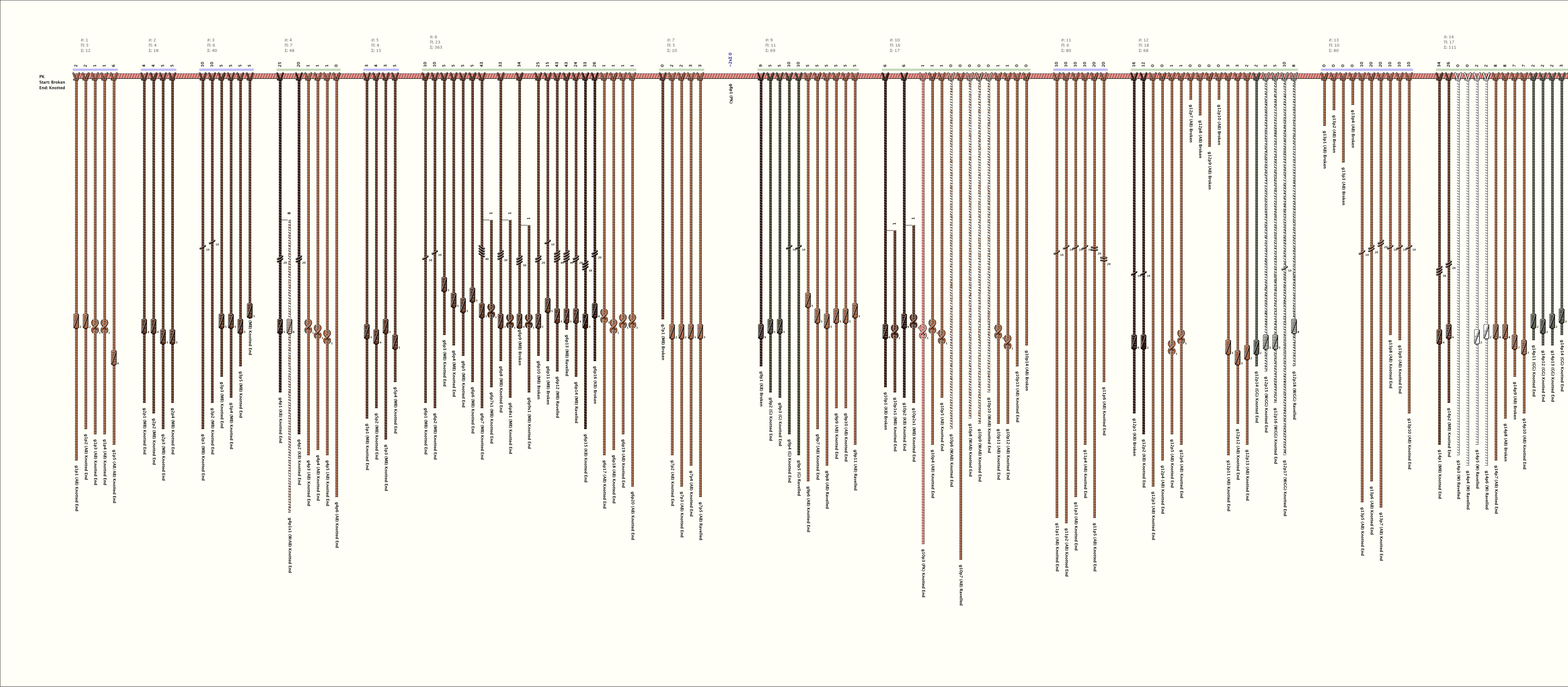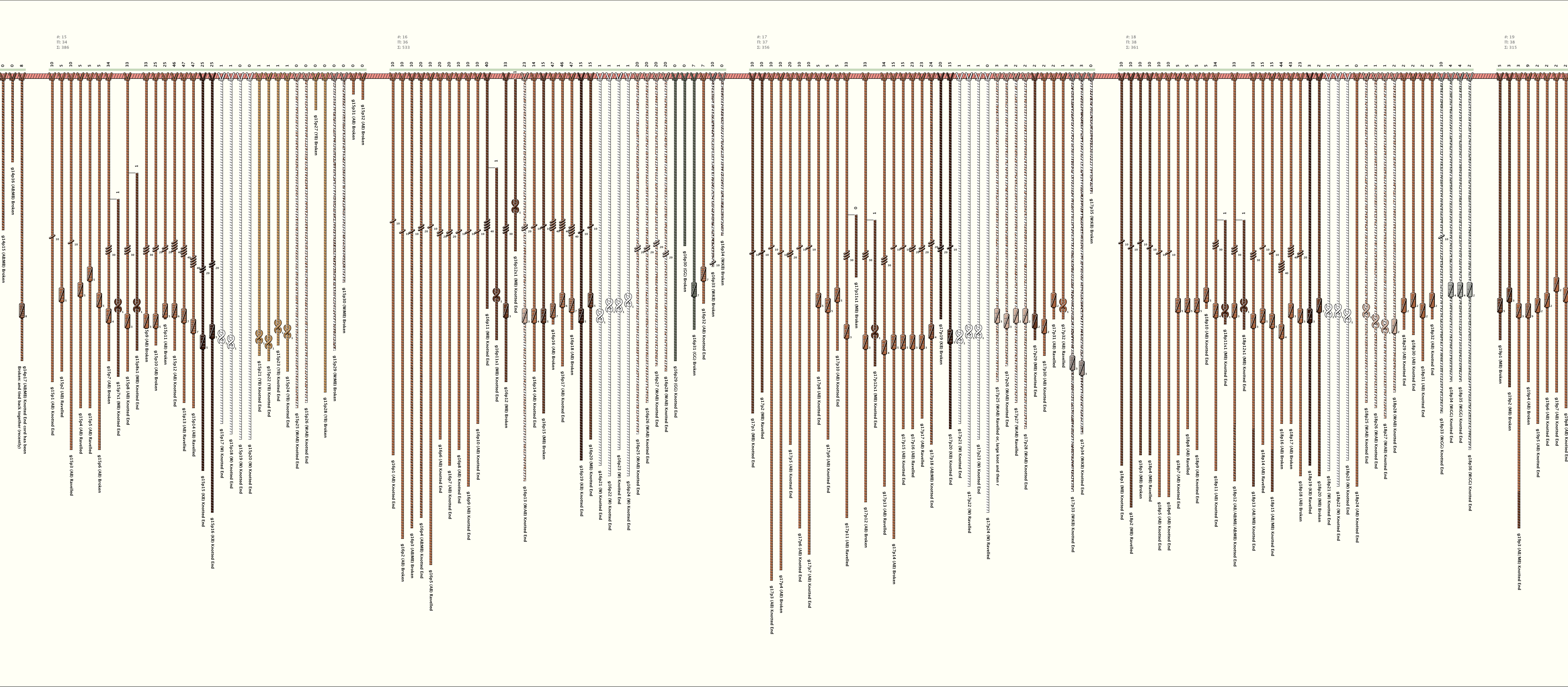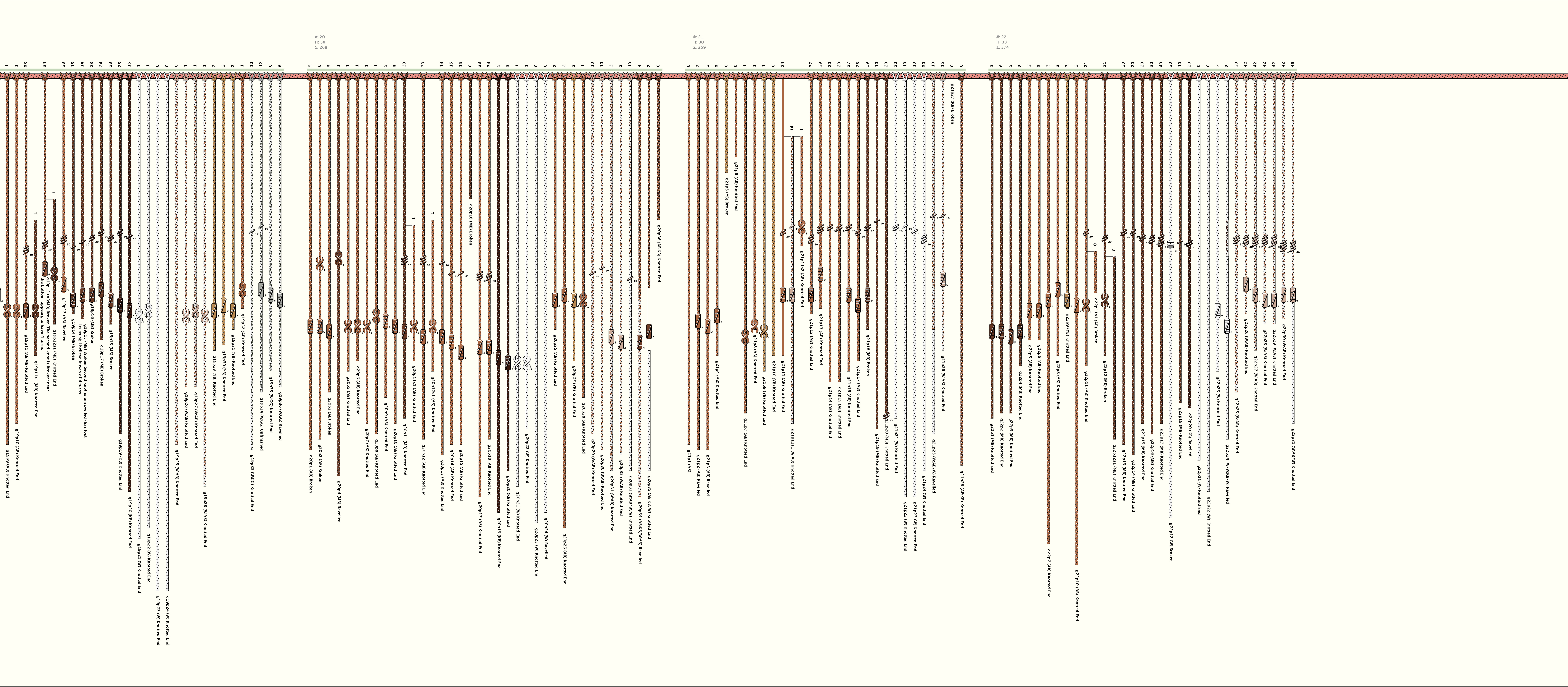# of Groups & Cords: 22 Groups, 417 Cords - (395p, 22s) # of Ascher Cord Colors: 14 Similar Khipu: Previous (KH0296) Next (KH0316) Catalog: KH0428 Khipu Notes: |