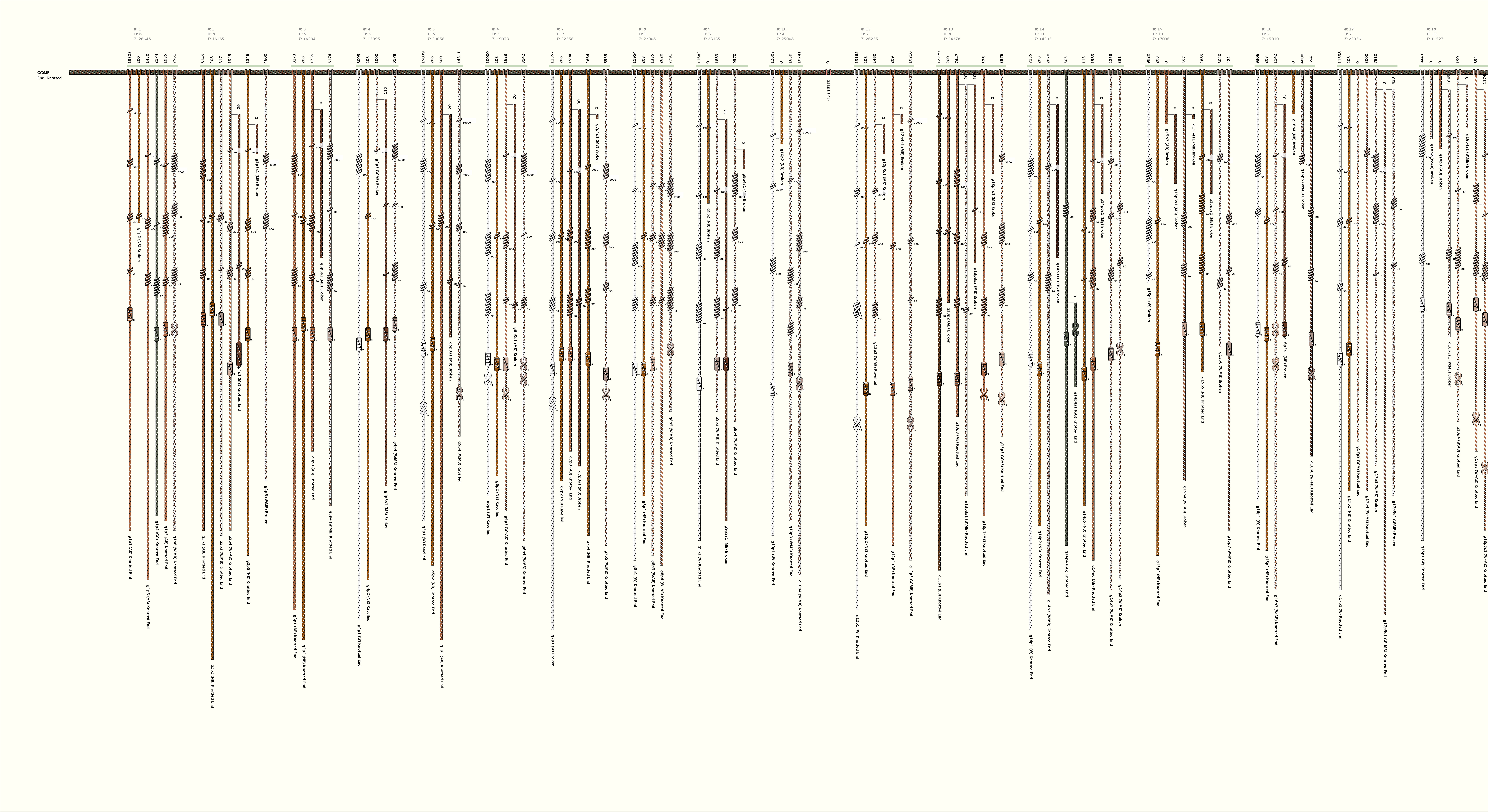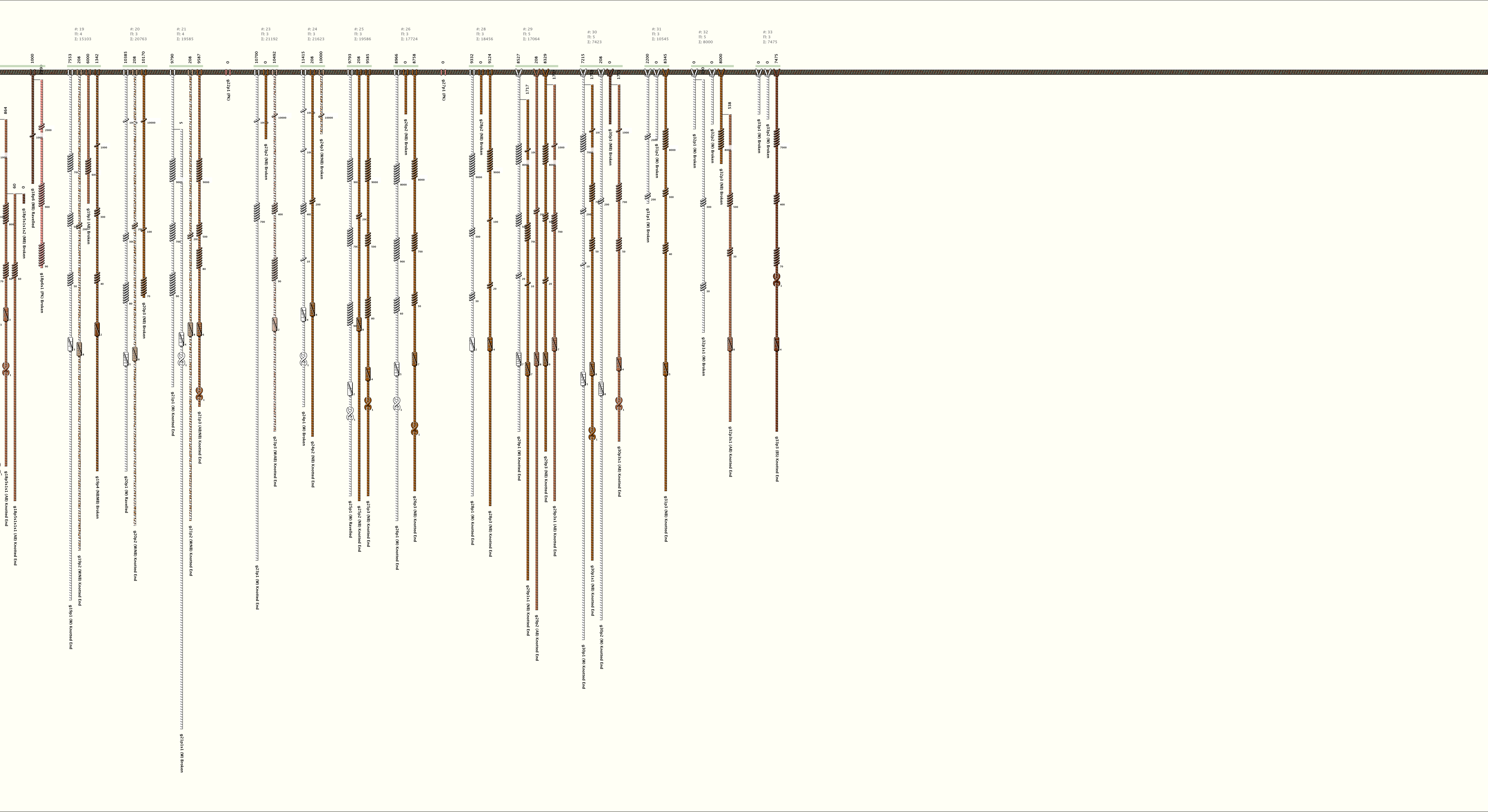 # of Groups & Cords: 33 Groups, 169 Cords - (131p, 38s) # of Ascher Cord Colors: 17 Similar Khipu: Previous (KH0562) Next (KH0514) Catalog: KH0505 Khipu Notes: |