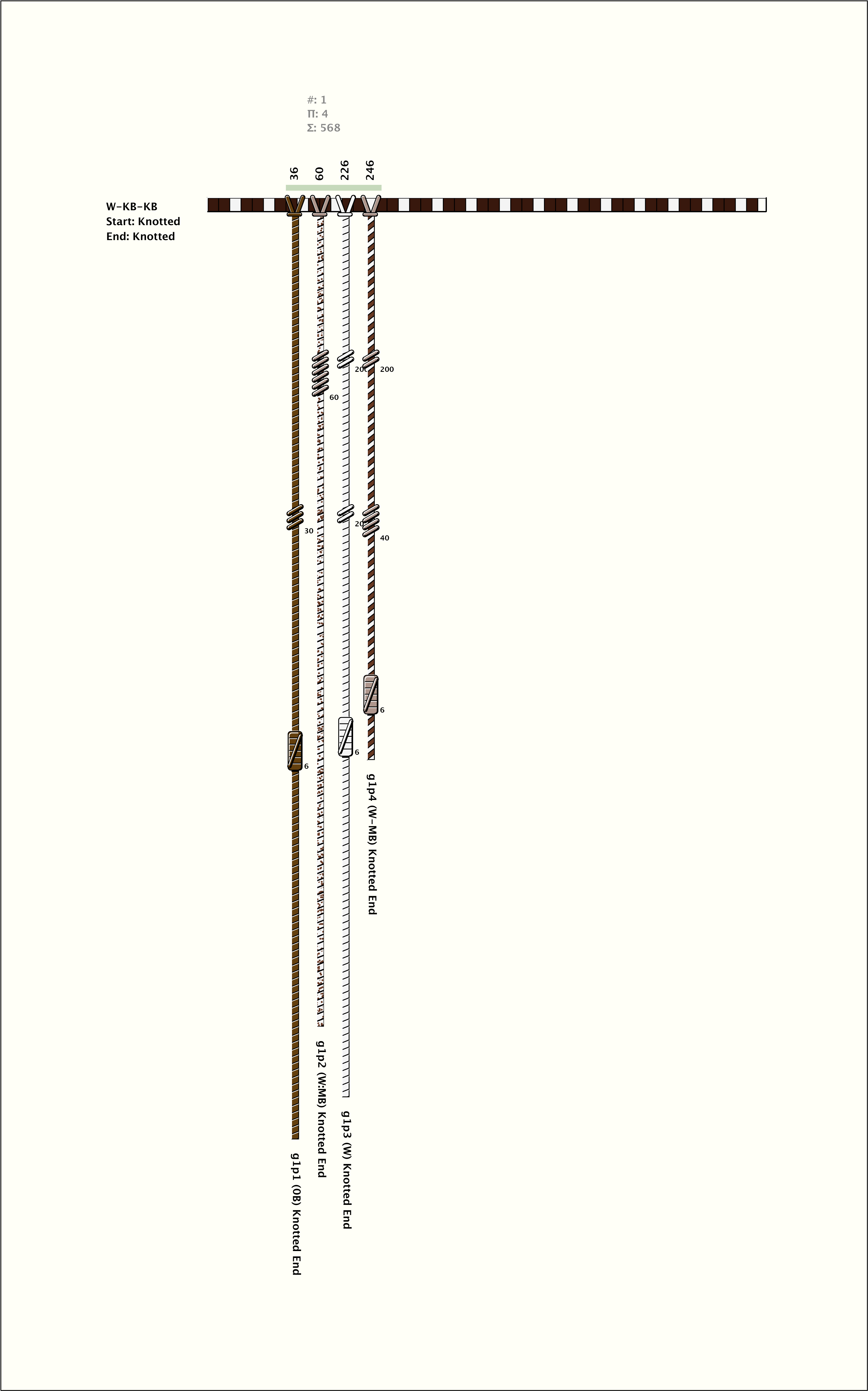 # of Groups & Cords: 1 Groups, 4 Cords - 4p # of Ascher Cord Colors: 5 Similar Khipu: Previous (KH0626) Next (KH0532) Catalog: KH0531 Khipu Notes: |