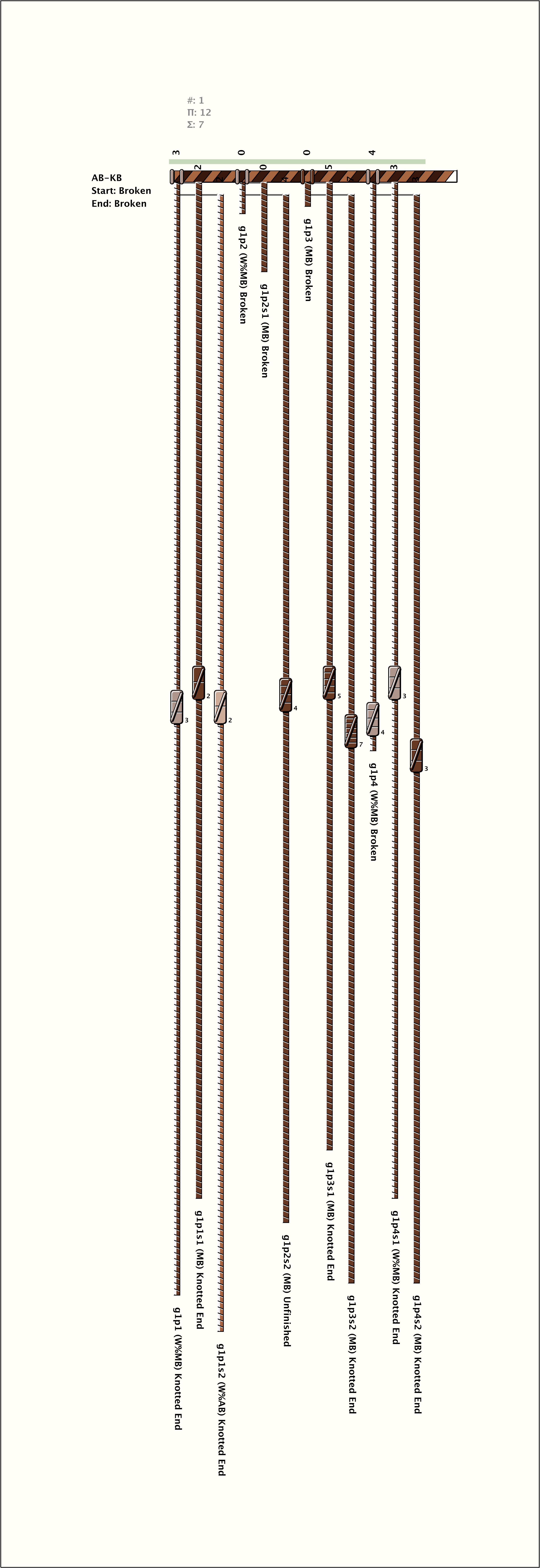 # of Groups & Cords: 1 Groups, 12 Cords - (4p, 8s) # of Ascher Cord Colors: 4 Similar Khipu: Previous (KH0388) Next (KH0414) Catalog: KH0548 Khipu Notes: |