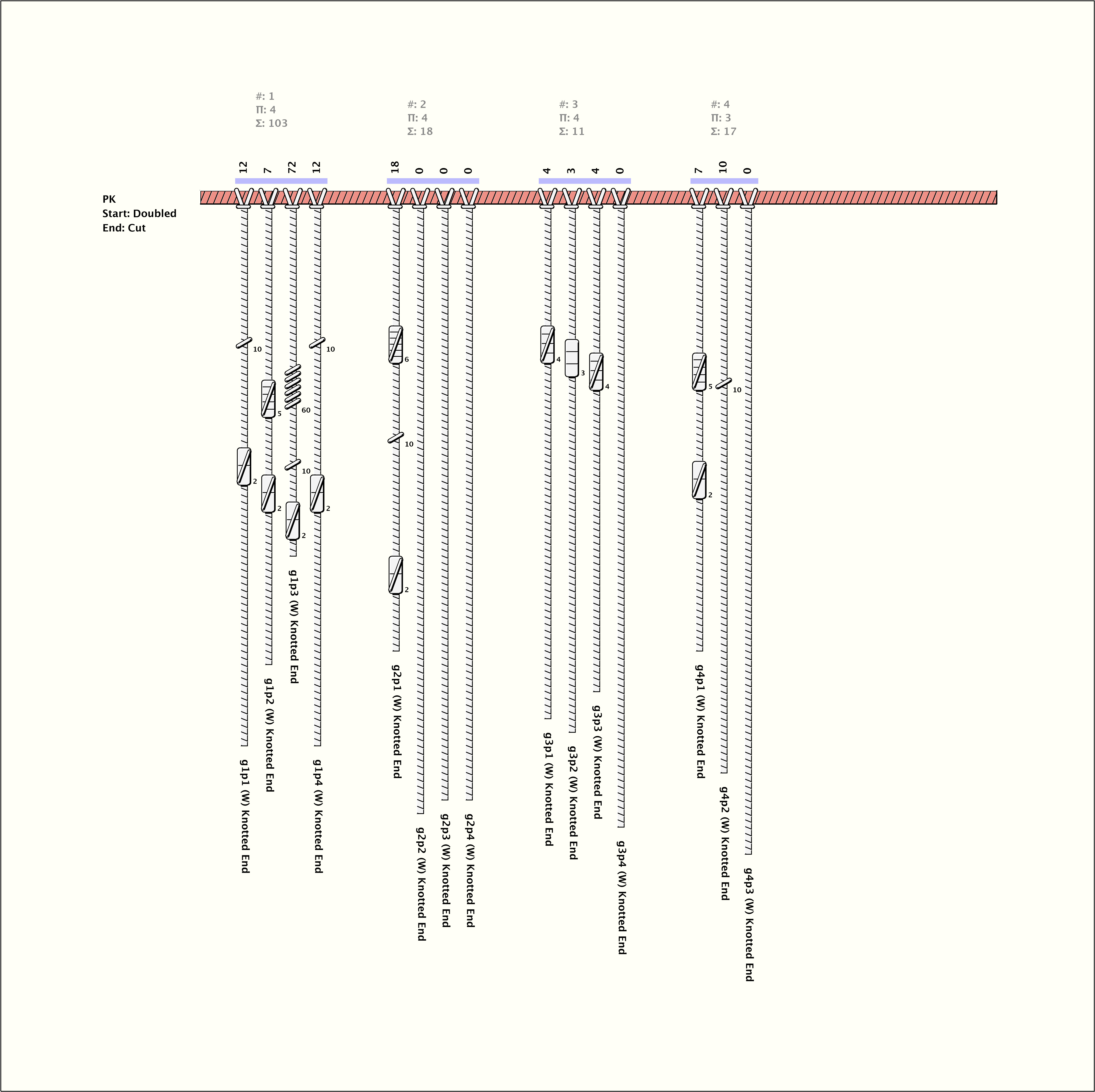 # of Groups & Cords: 4 Groups, 15 Cords - 15p # of Ascher Cord Colors: 2 Similar Khipu: Previous (KH0298) Next (KH0089) Catalog: KH0564 Khipu Notes: |
