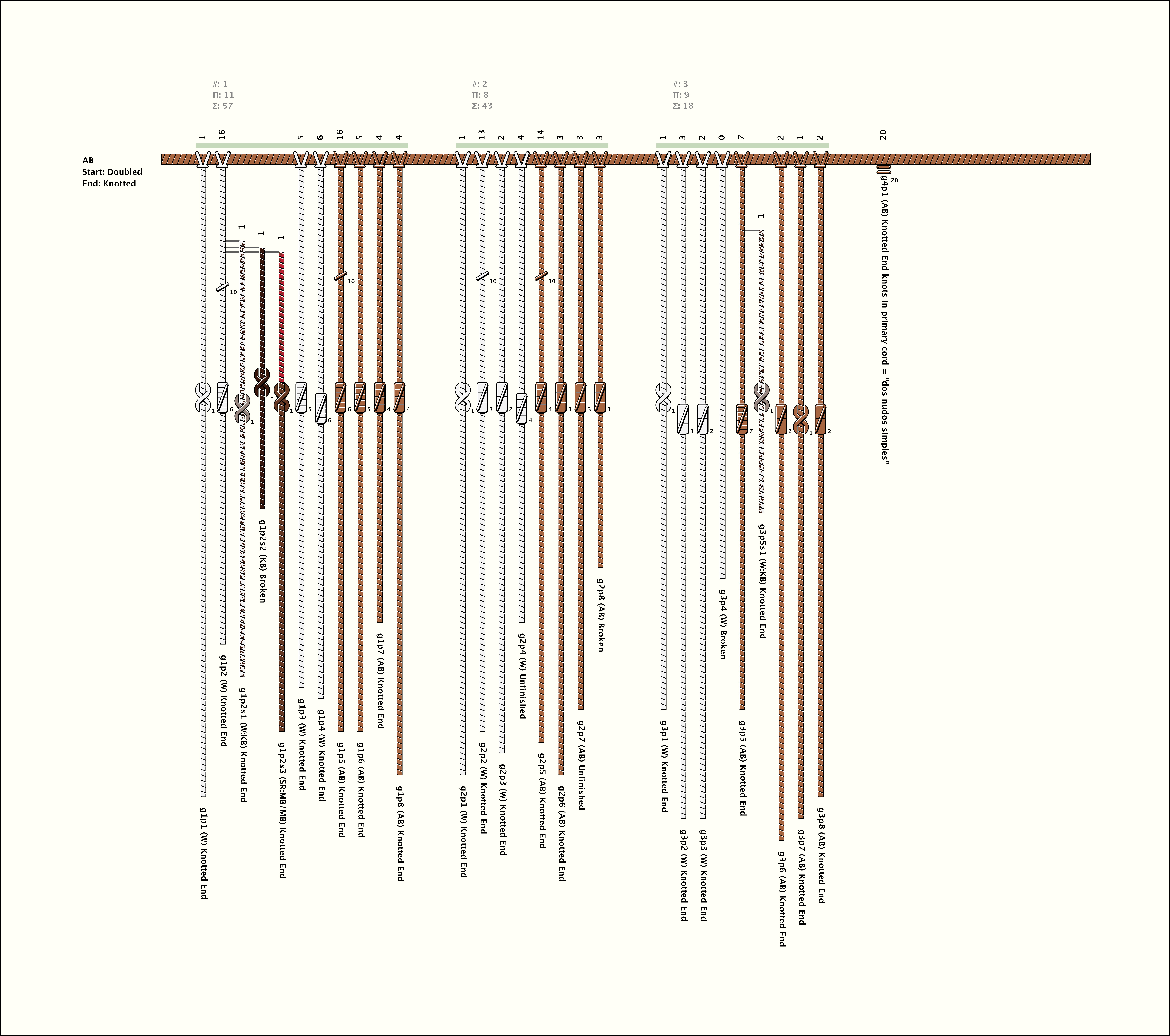 # of Groups & Cords: 4 Groups, 29 Cords - (25p, 4s) # of Ascher Cord Colors: 6 Similar Khipu: Previous (KH0488) Next (KH0395) Catalog: KH0565 Khipu Notes: |