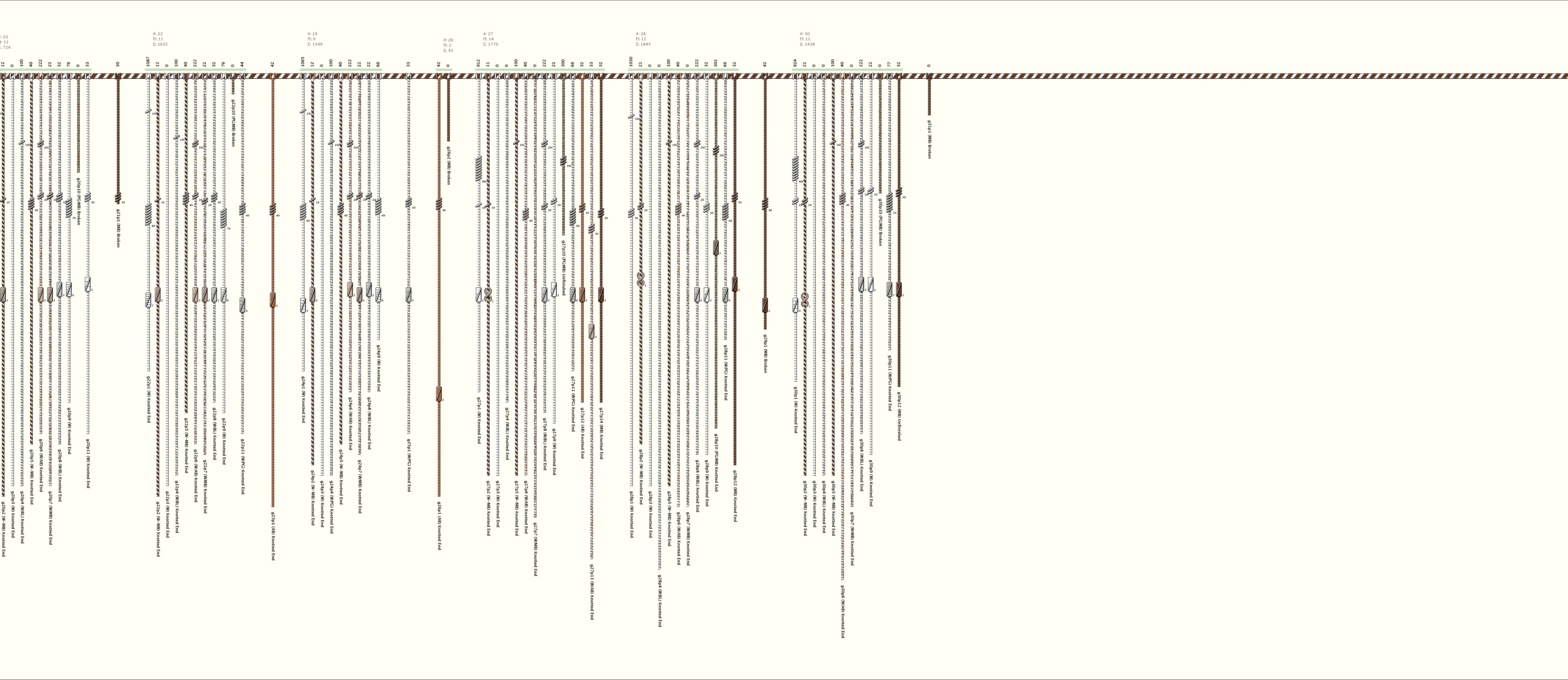 # of Groups & Cords: 31 Groups, 189 Cords - 189p # of Ascher Cord Colors: 12 Similar Khipu: Previous (KH0421) Next (KH0435) Catalog: KH0586 Khipu Notes: |