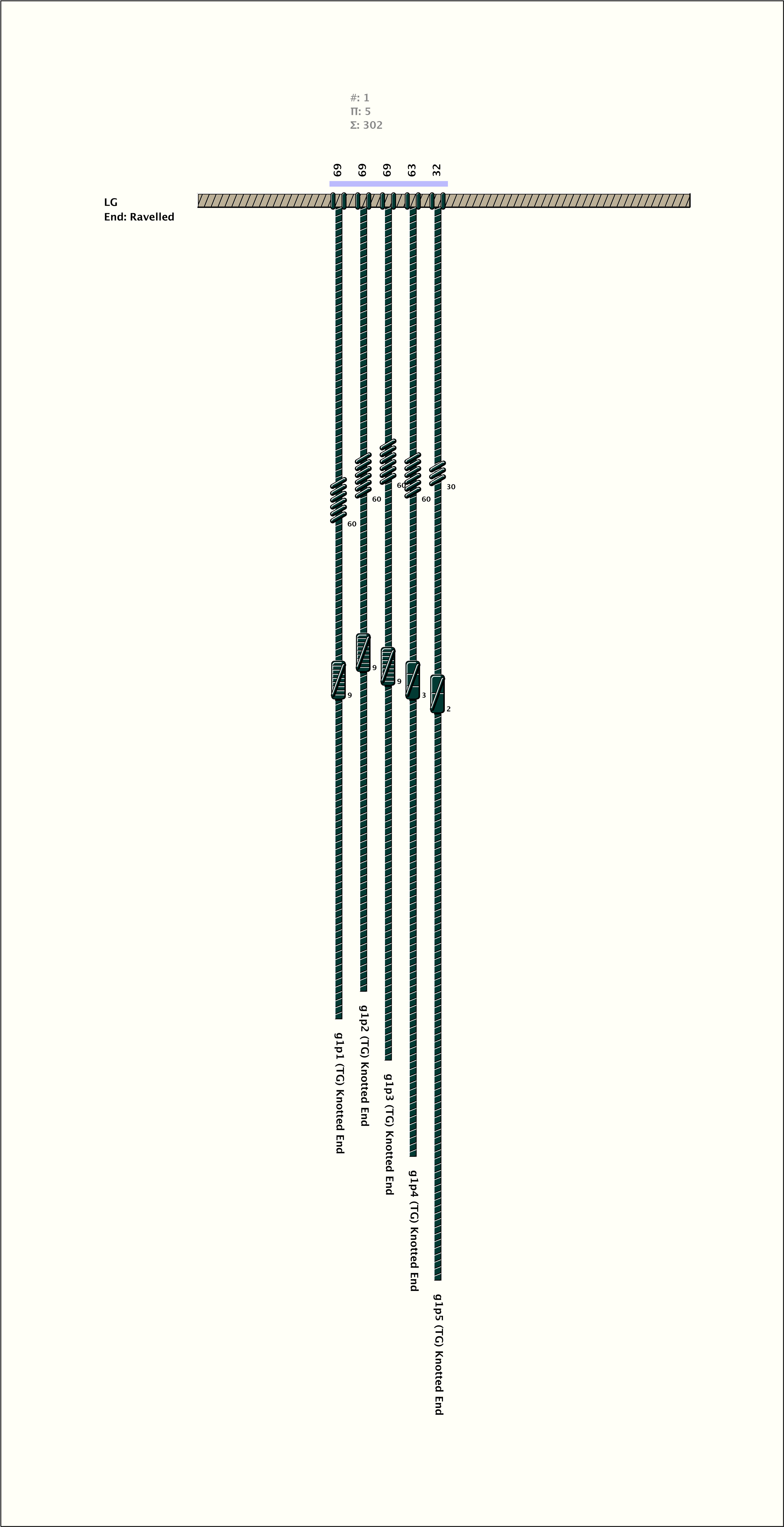 # of Groups & Cords: 1 Groups, 5 Cords - 5p # of Ascher Cord Colors: 2 Similar Khipu: Previous (KH0623) Next (KH0627) Catalog: KH0624 Khipu Notes: |